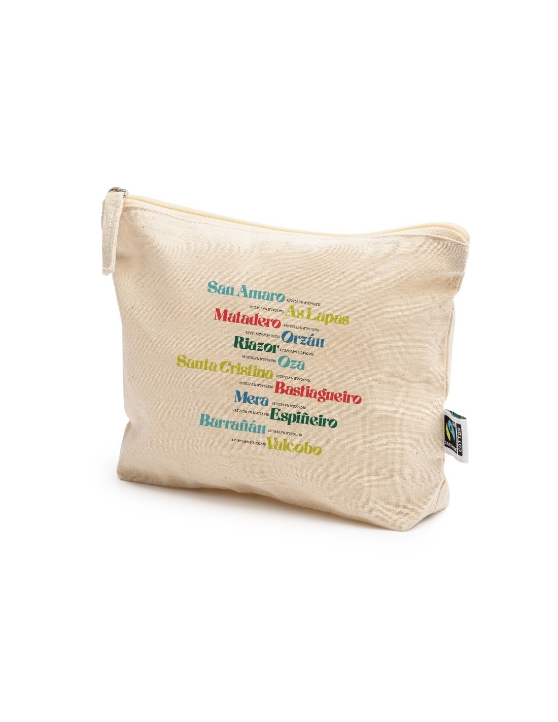 Práctico y ligero neceser de algodón con cierre de cremallera decorado con las playas de A Coruña y sus coordenadas para llegar.