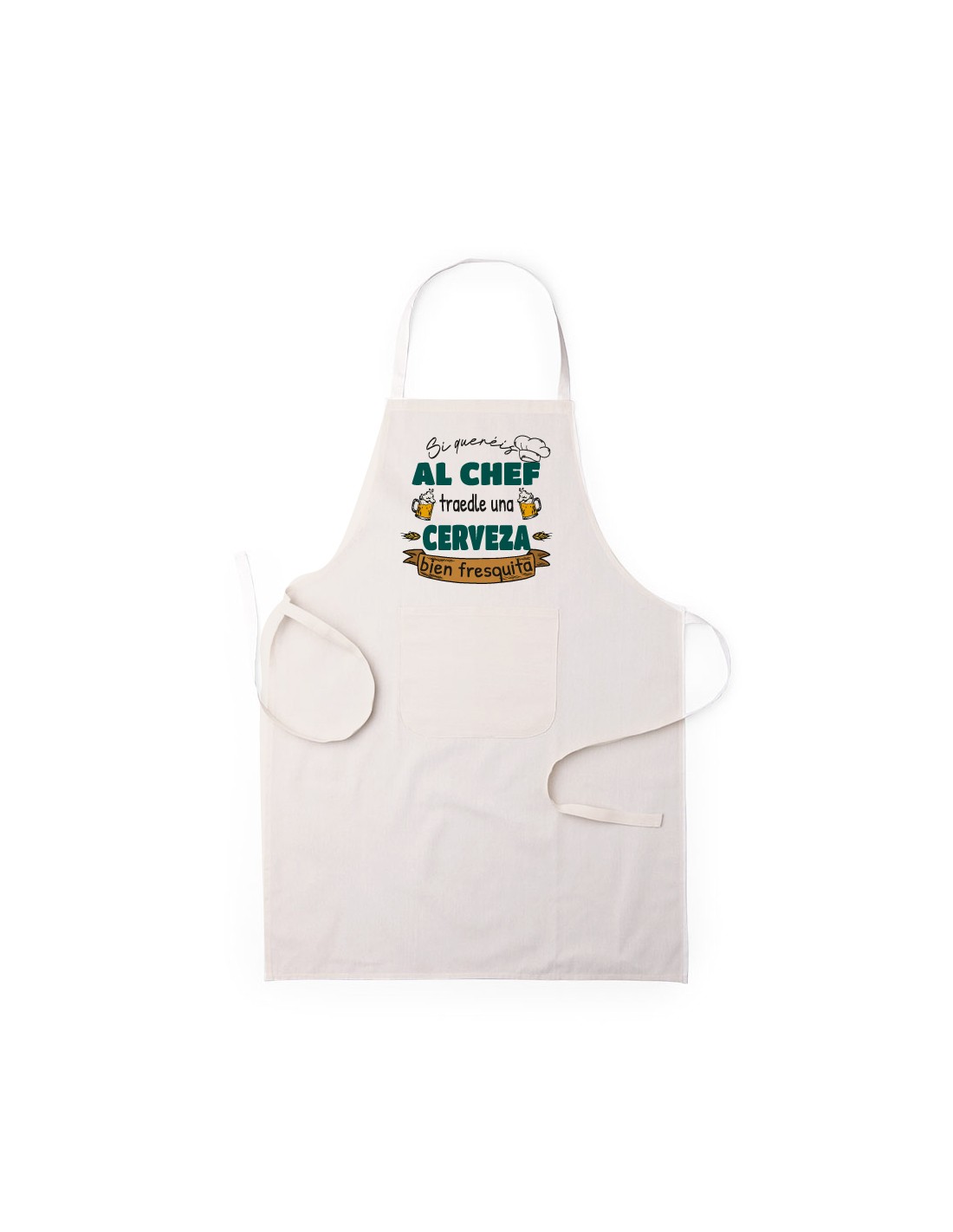 Original y divertido delantal decorado con el mensaje "si queréis al chef traedle una cerveza bien fresquita".