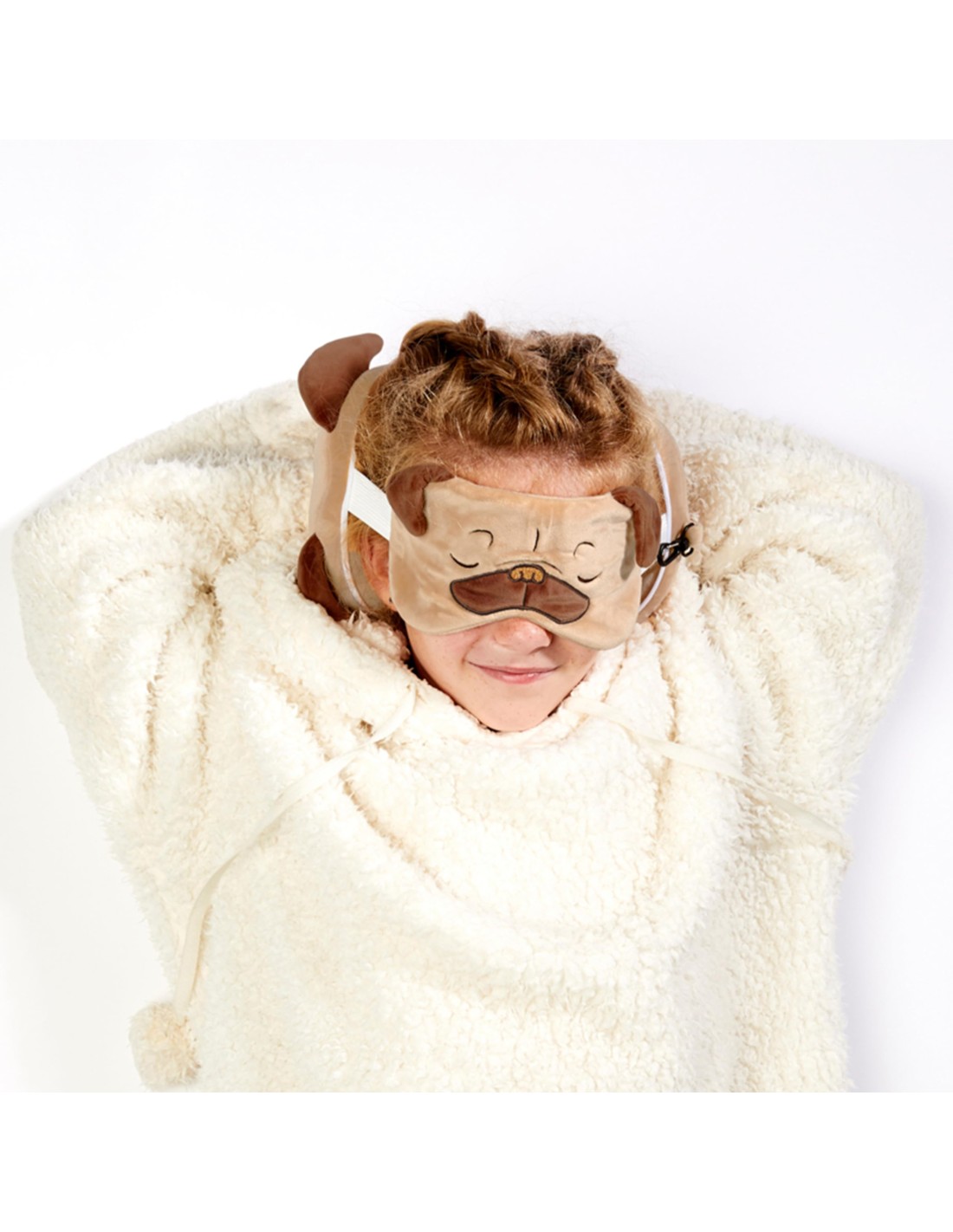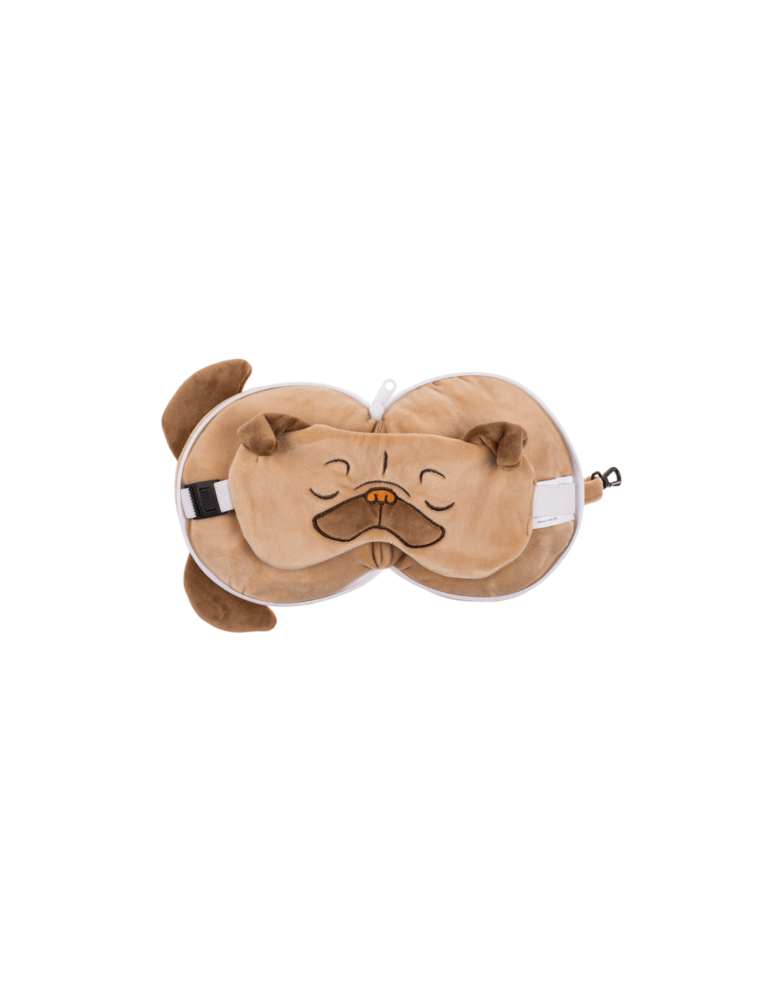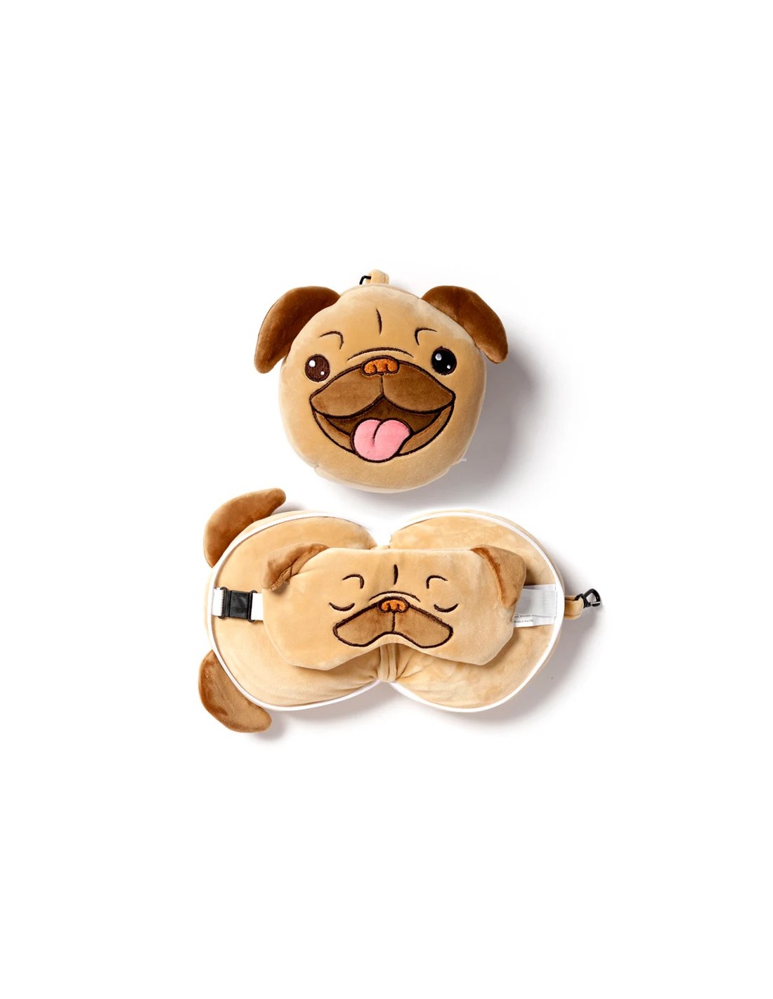 Original almohada de viaje en forma de pug con antifaz incluído.