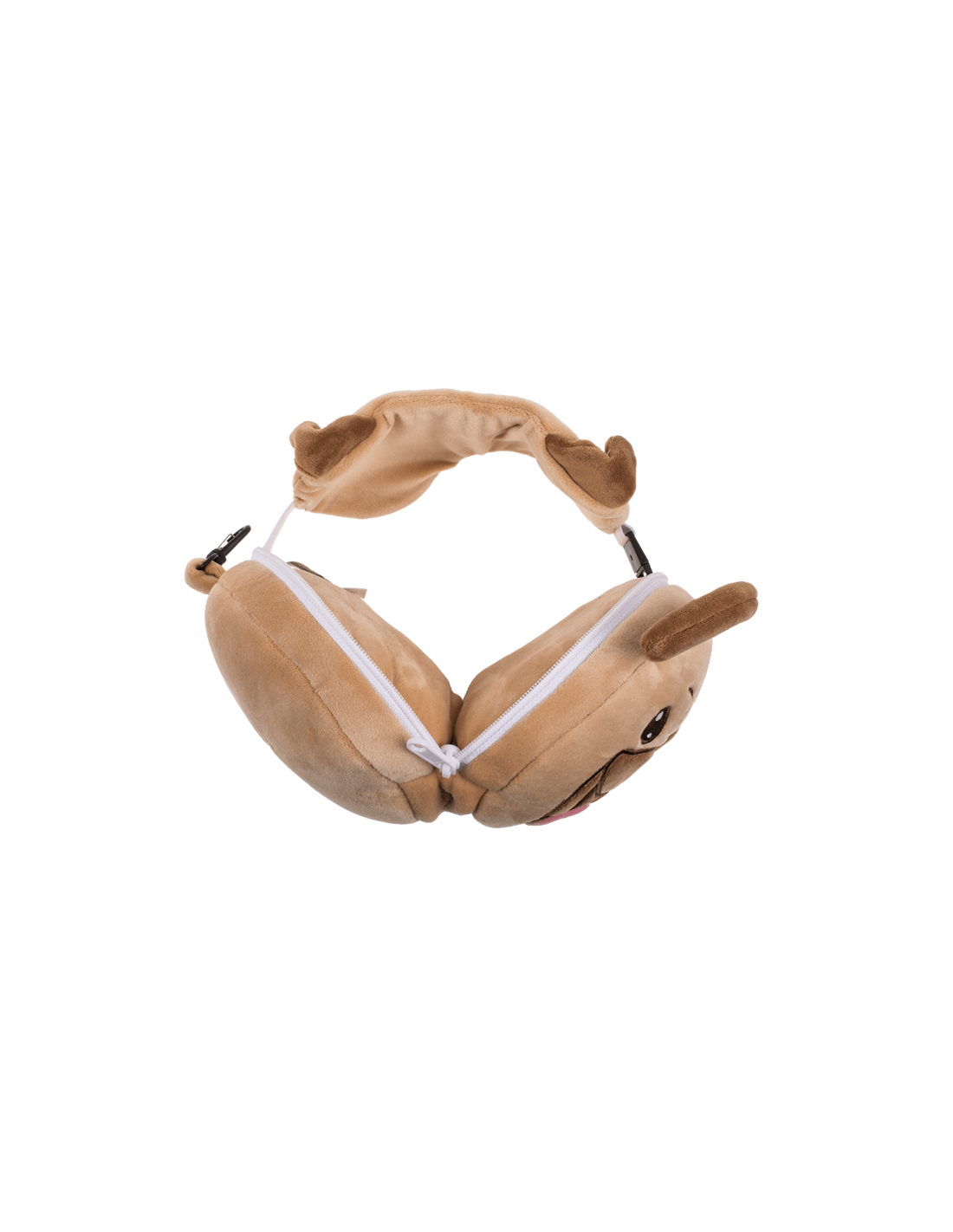 Esta almohada de viaje en forma de pug está fabricada en poliéster y elastano, la máscara para dormir cuenta con un sistema de liberación rápida para un uso sencillo e incluye un práctico clip de plástico para sujetarla al cinturón o al bolso y así evitar perderla.