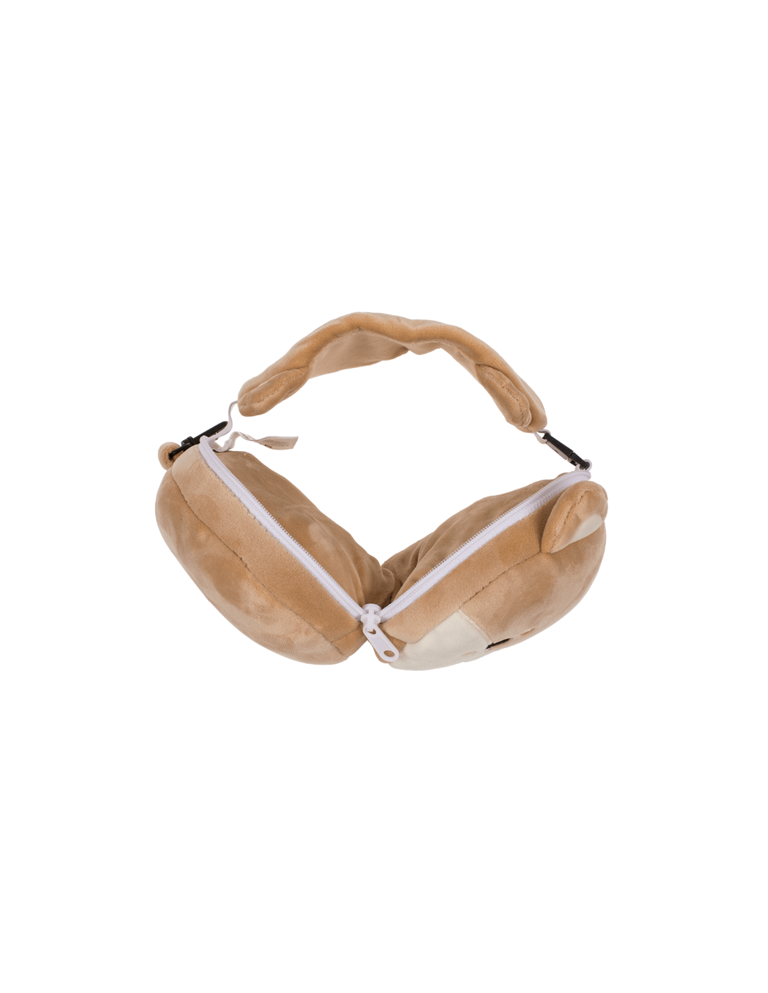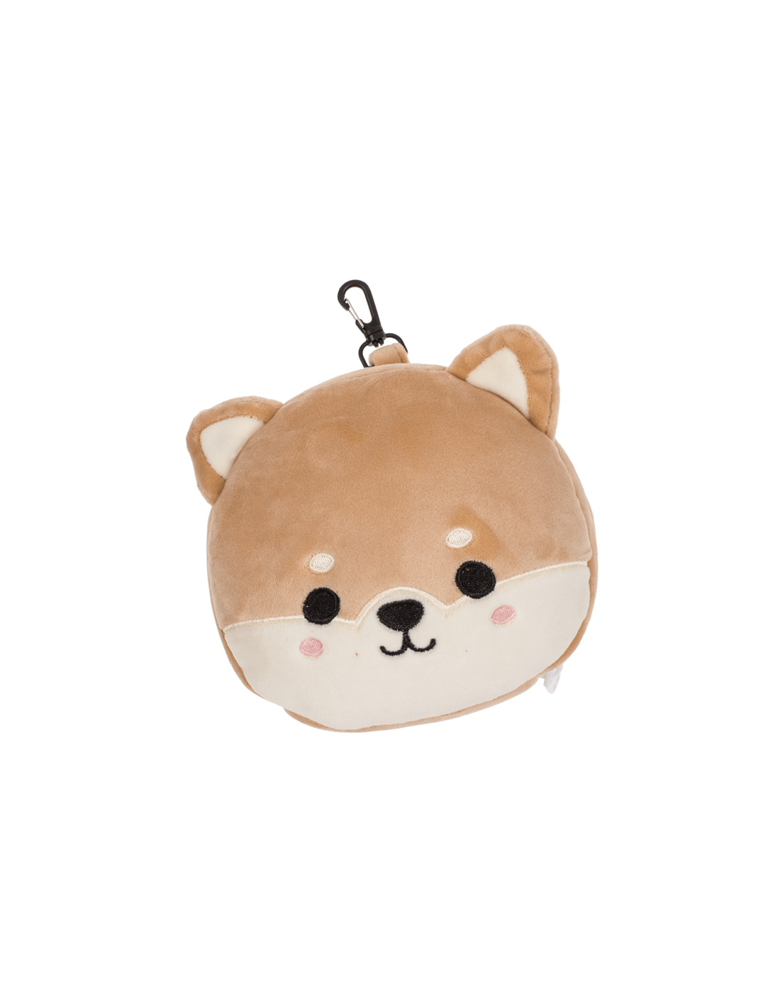 Esta almohada de viaje en forma de shiba está fabricada en poliéster y elastano, la máscara para dormir cuenta con un sistema de liberación rápida para un uso sencillo e incluye un práctico clip de plástico para sujetarla al cinturón o al bolso y así evitar perderla.