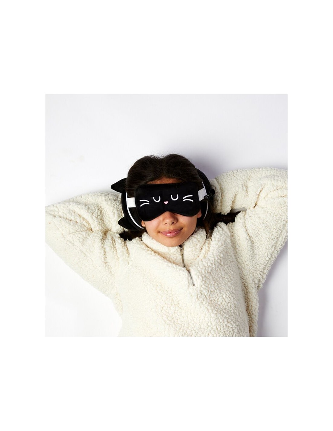 Esta almohada de viaje en forma de gatito negro está fabricada en poliéster y elastano, la máscara para dormir cuenta con un sistema de liberación rápida para un uso sencillo e incluye un práctico clip de plástico para sujetarla al cinturón o al bolso y así evitar perderla.