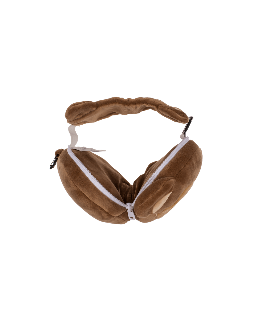 Esta almohada de viaje en forma de mono está fabricada en poliéster y elastano, la máscara para dormir cuenta con un sistema de liberación rápida para un uso sencillo e incluye un práctico clip de plástico para sujetarla al cinturón o al bolso y así evitar perderla.
