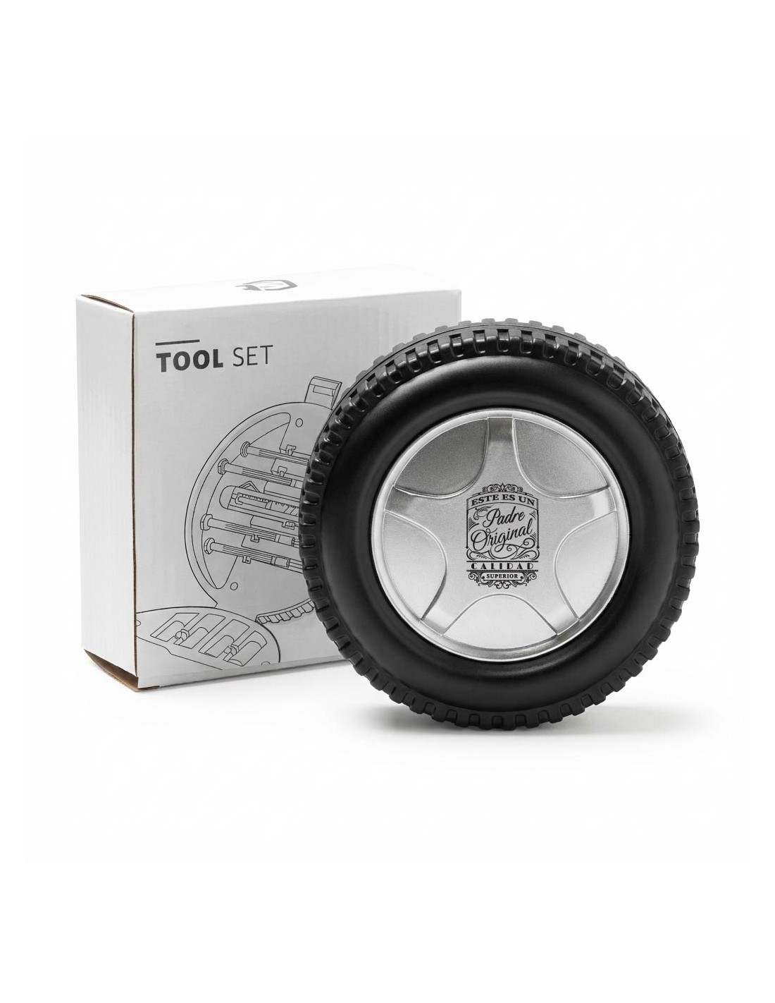 Original caja de herramientas en forma de rueda decorado con el mensaje "este es un padre original calidad superior".