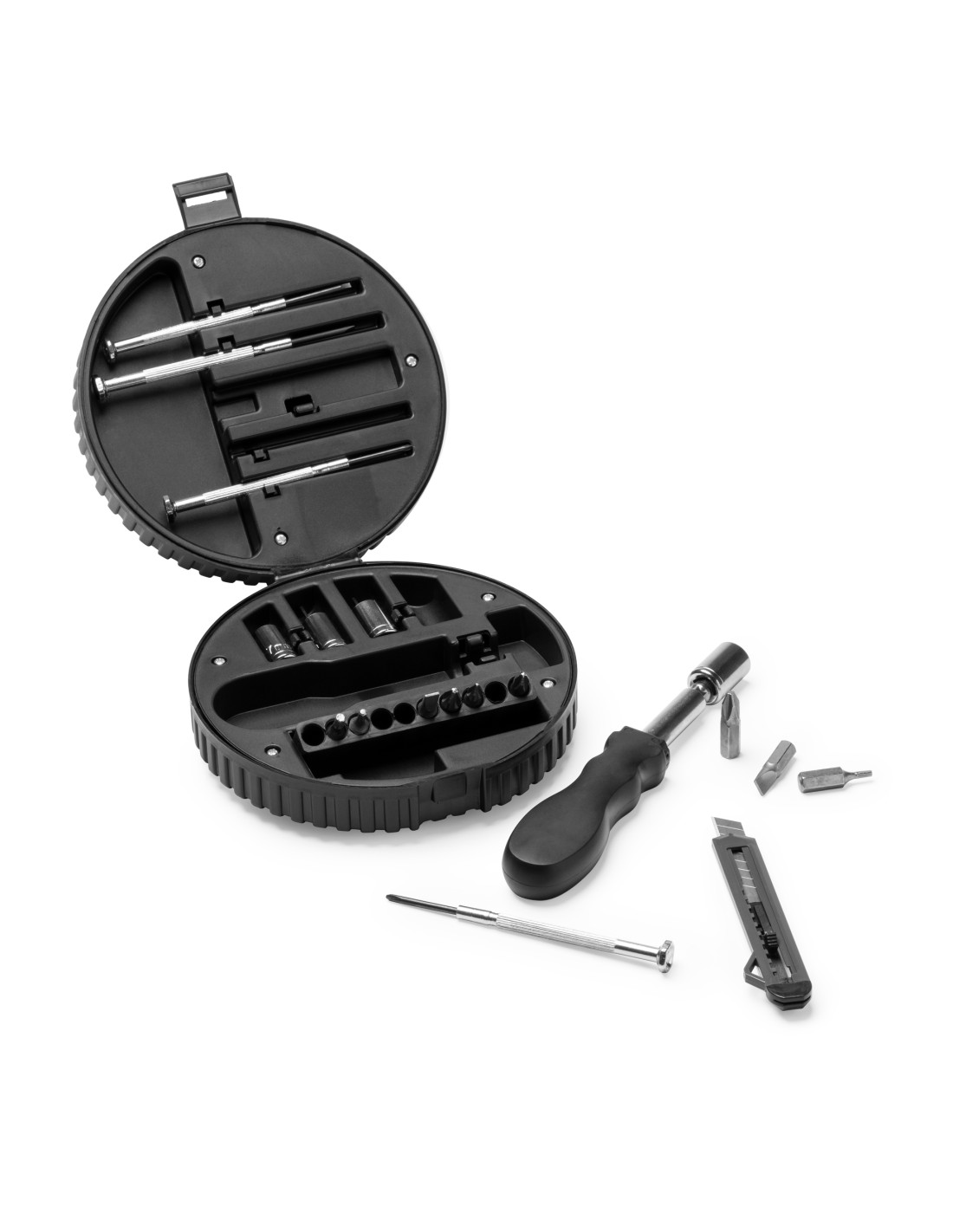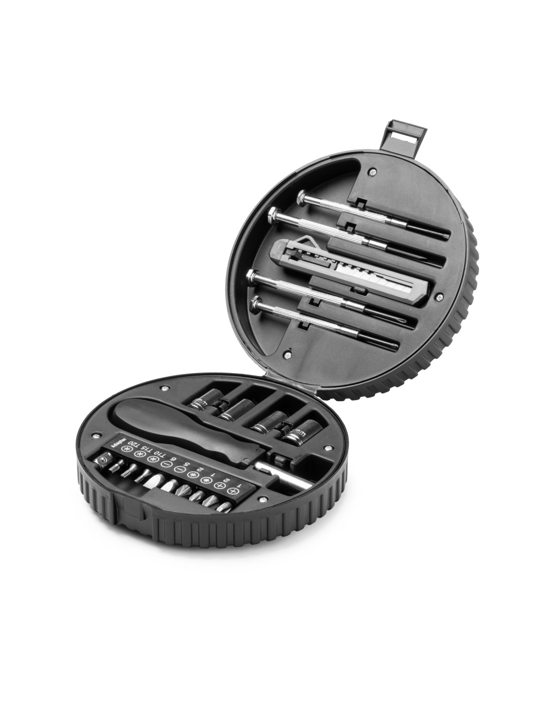 Este set contiene 20 herramientas como cutter, llaves hexagonales, destornilladores planos y de estrella, y herramienta de fijación.