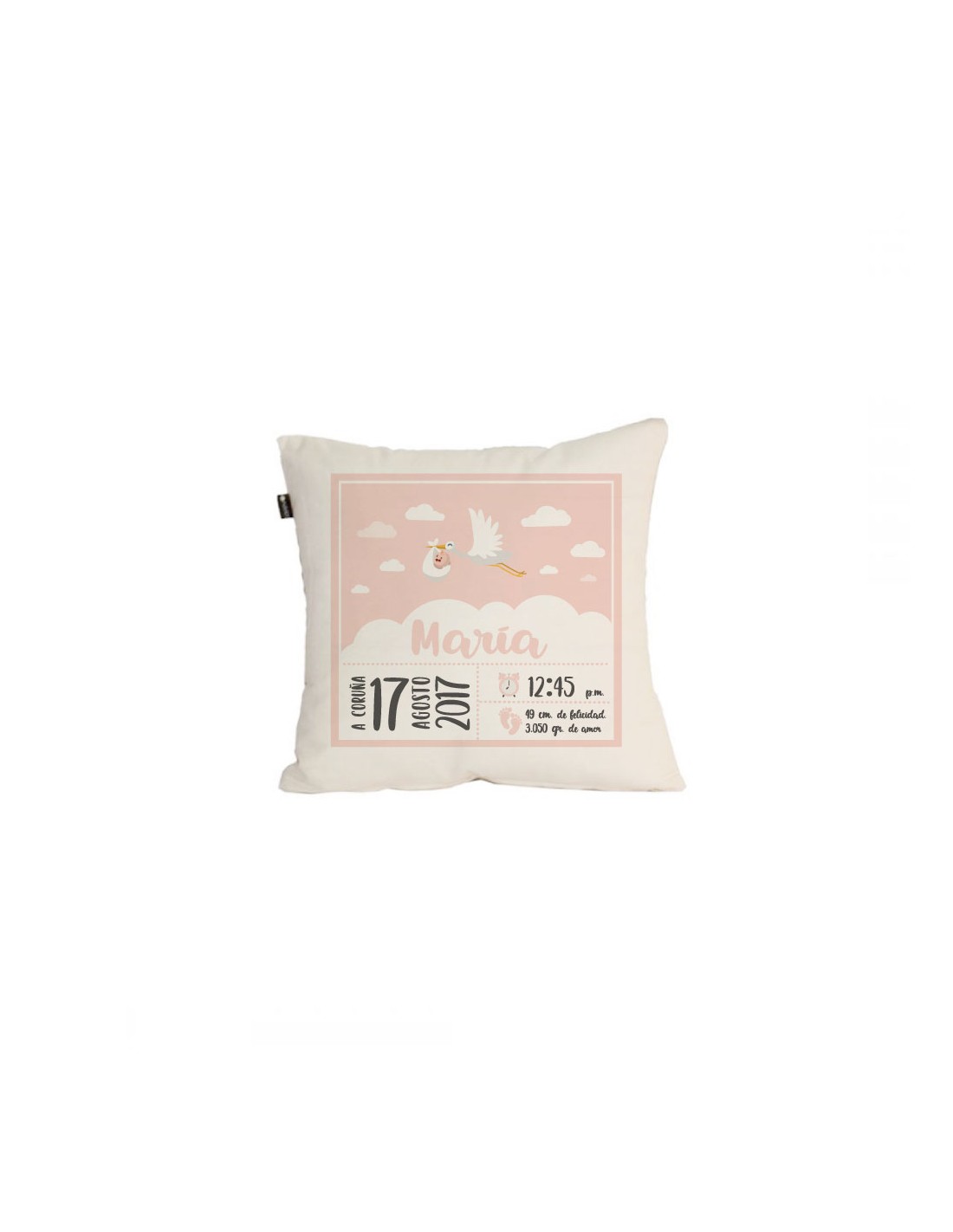 No olvide guardar su personalización para poder añadirla al carritoOriginal cojín personalizado con todos los datos del recién nacido.