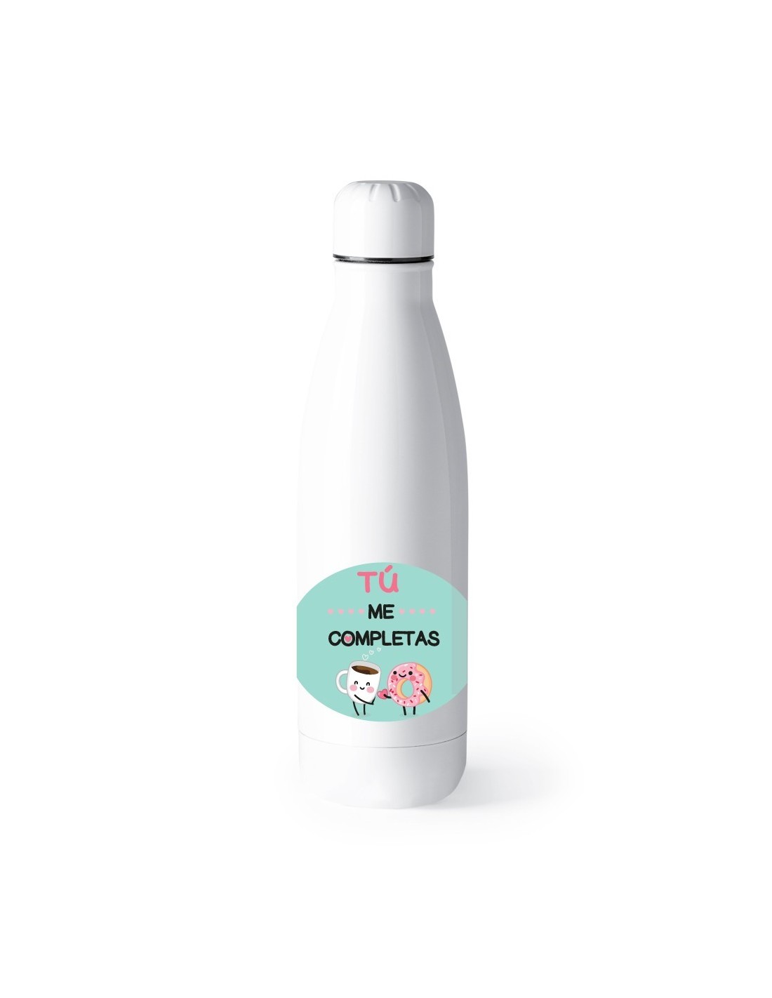 Original y práctico bidón termo con doble pared decorado con el mensaje "Tú me completas".