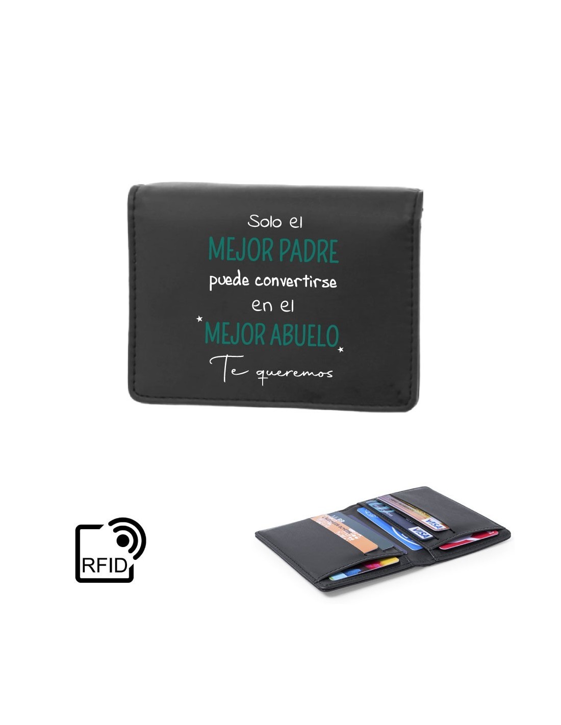 Original tarjetero RFID de polipiel negro decorado con el mensaje "Solo el mejor padre puede convertirse en el mejor abuelo, te queremos".
