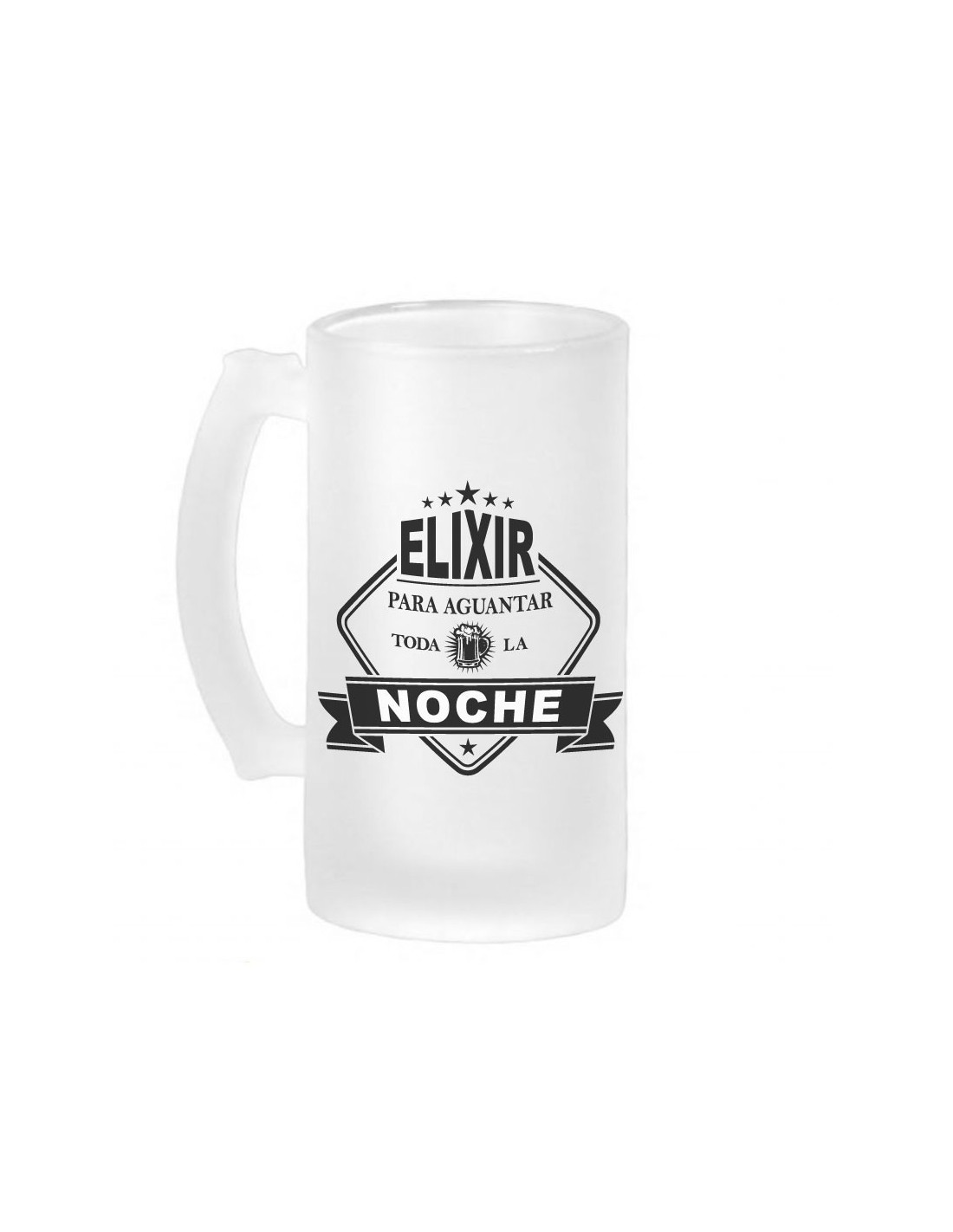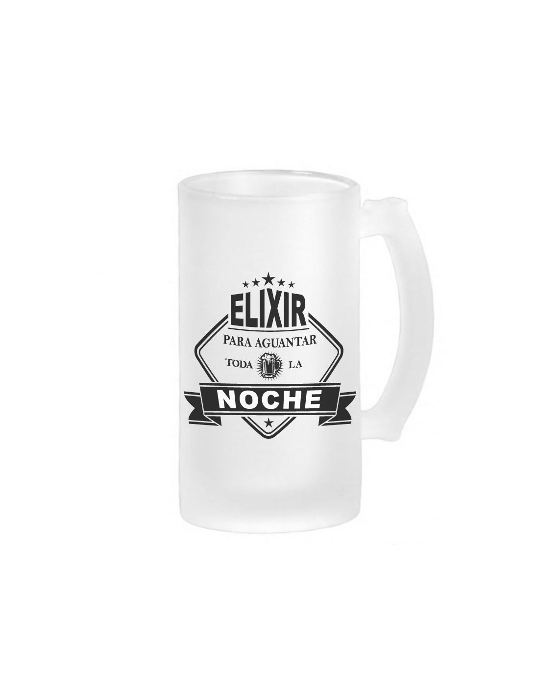 Original jarra de cerveza de vidrio esmerilado con efecto congelado, decorada con el mensaje "elixir para aguantar toda la noche".