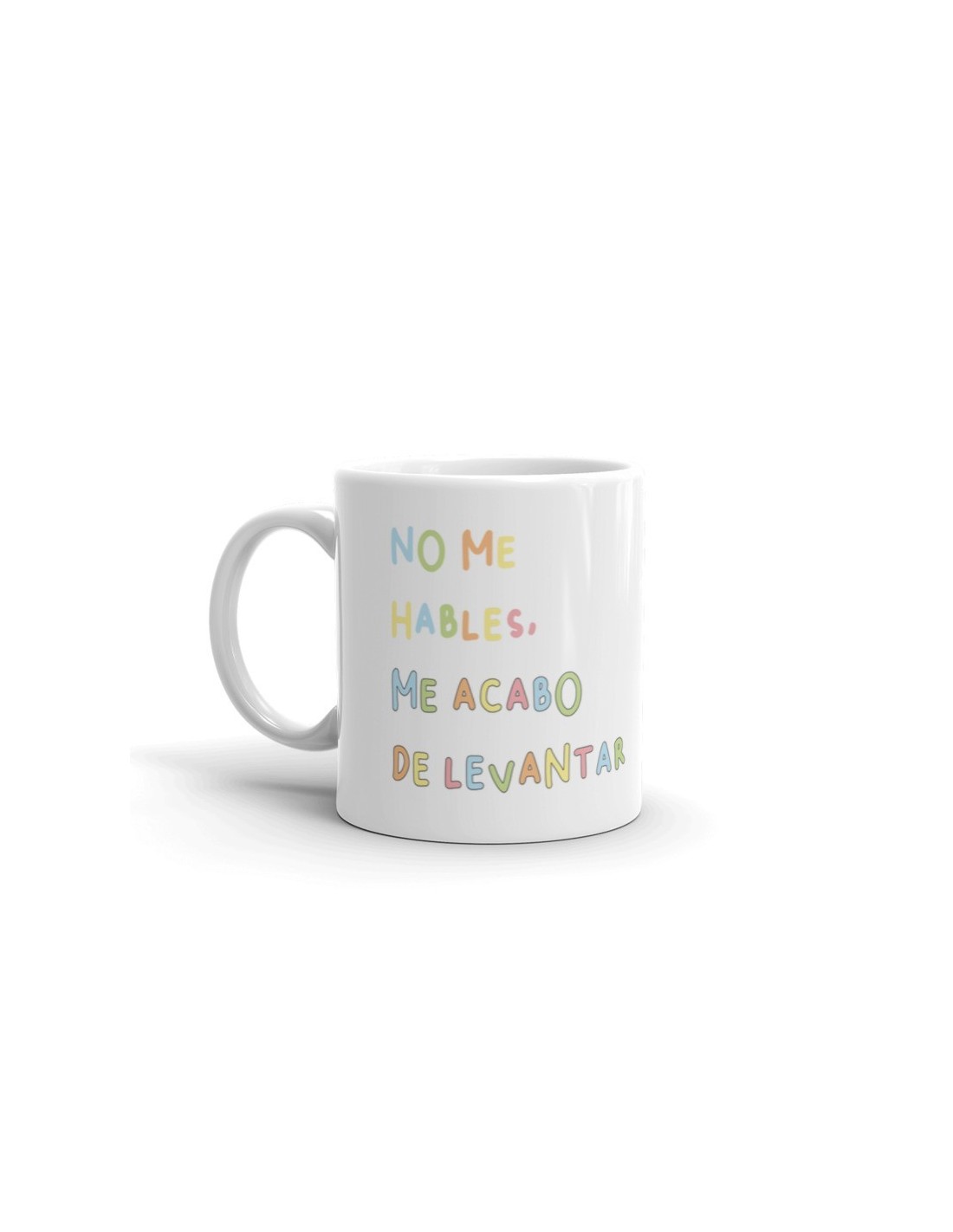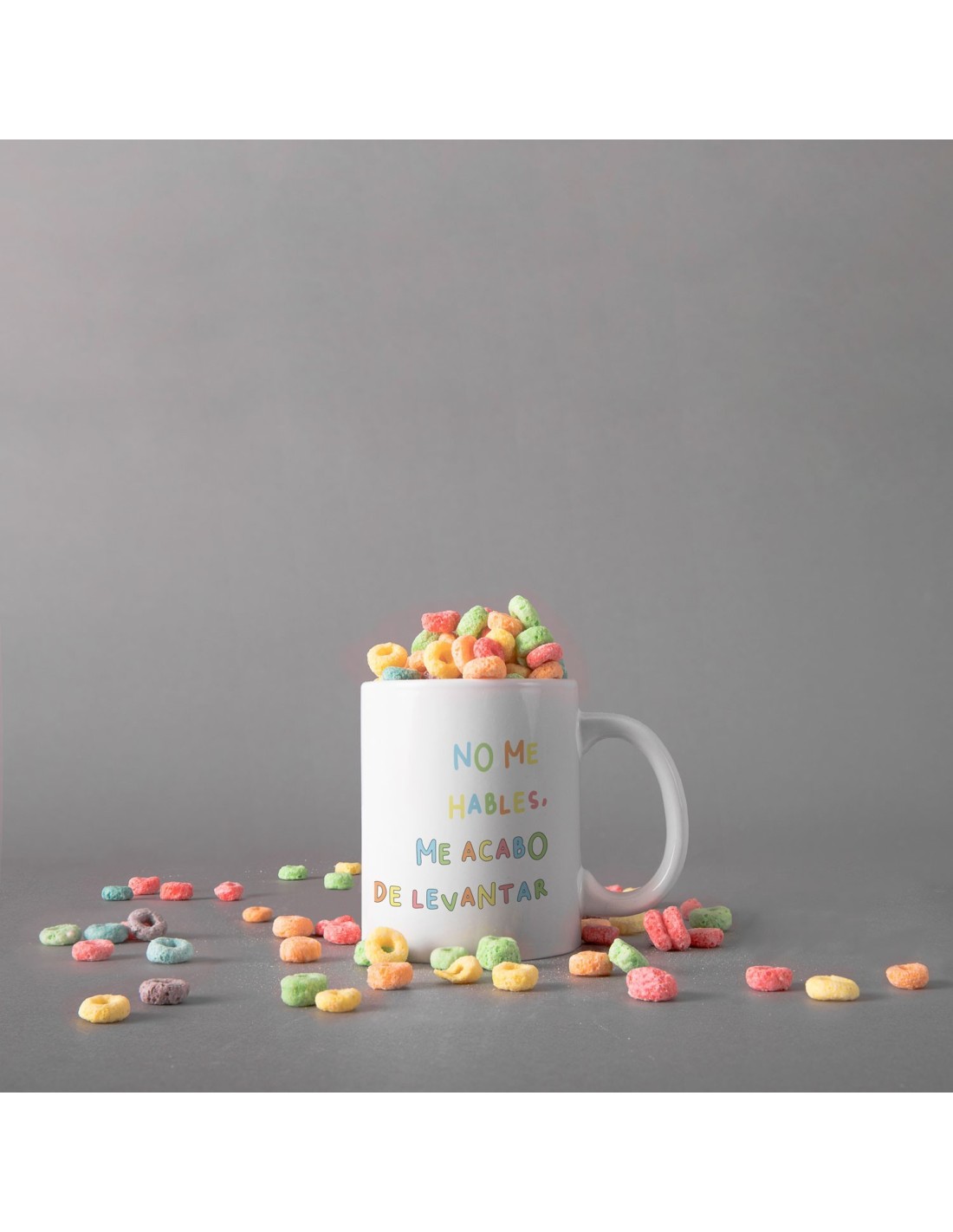 Divertida taza de porcelana blanca con asa decorada con el texto "No me hables, me acabo de levantar".