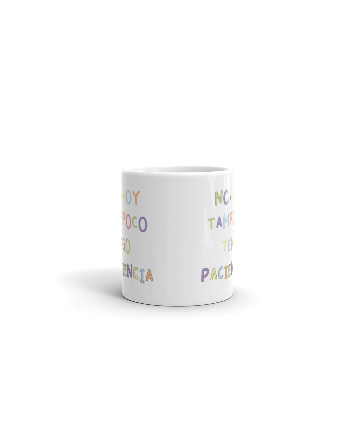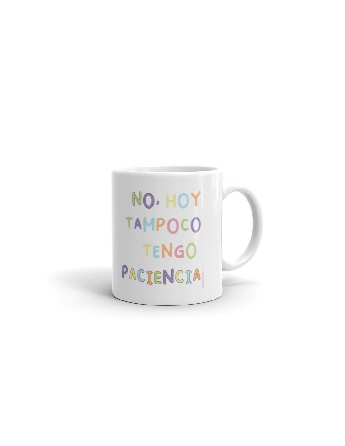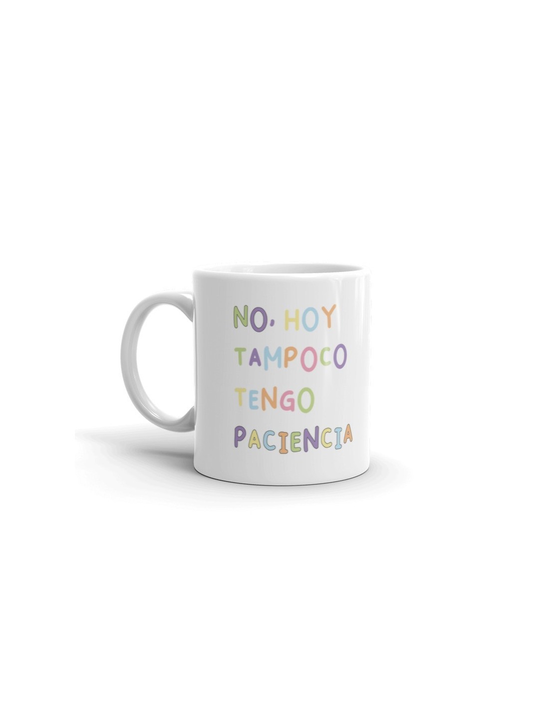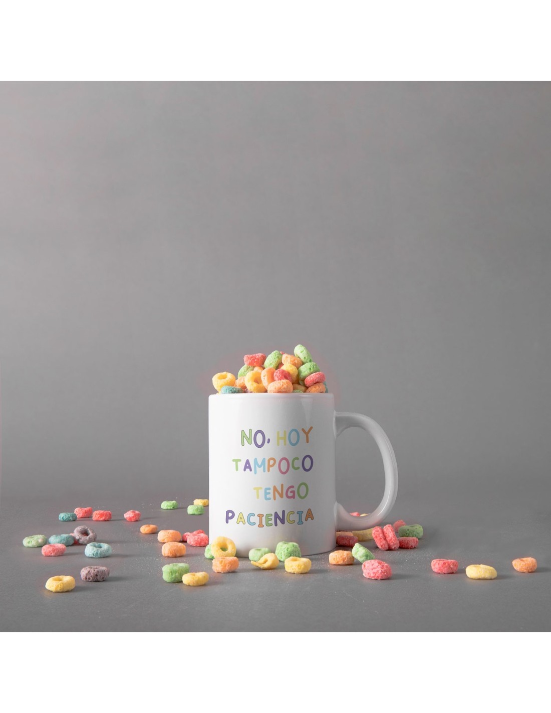 Divertida taza de porcelana blanca con asa decorada con el texto "No, hoy tampoco tengo paciencia".