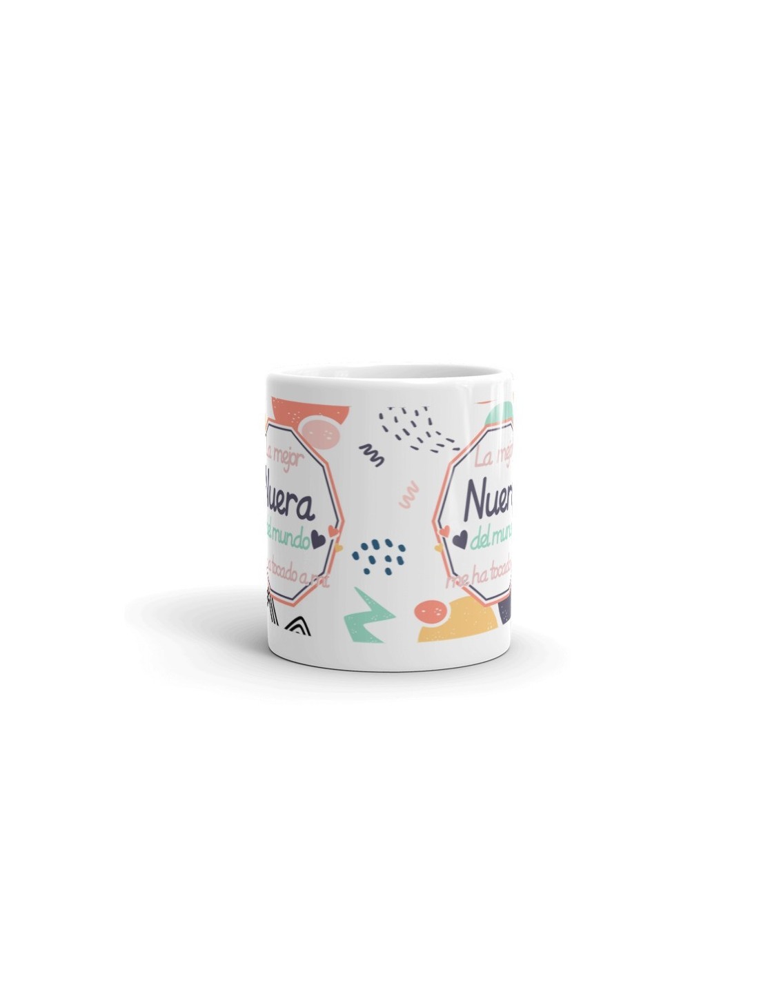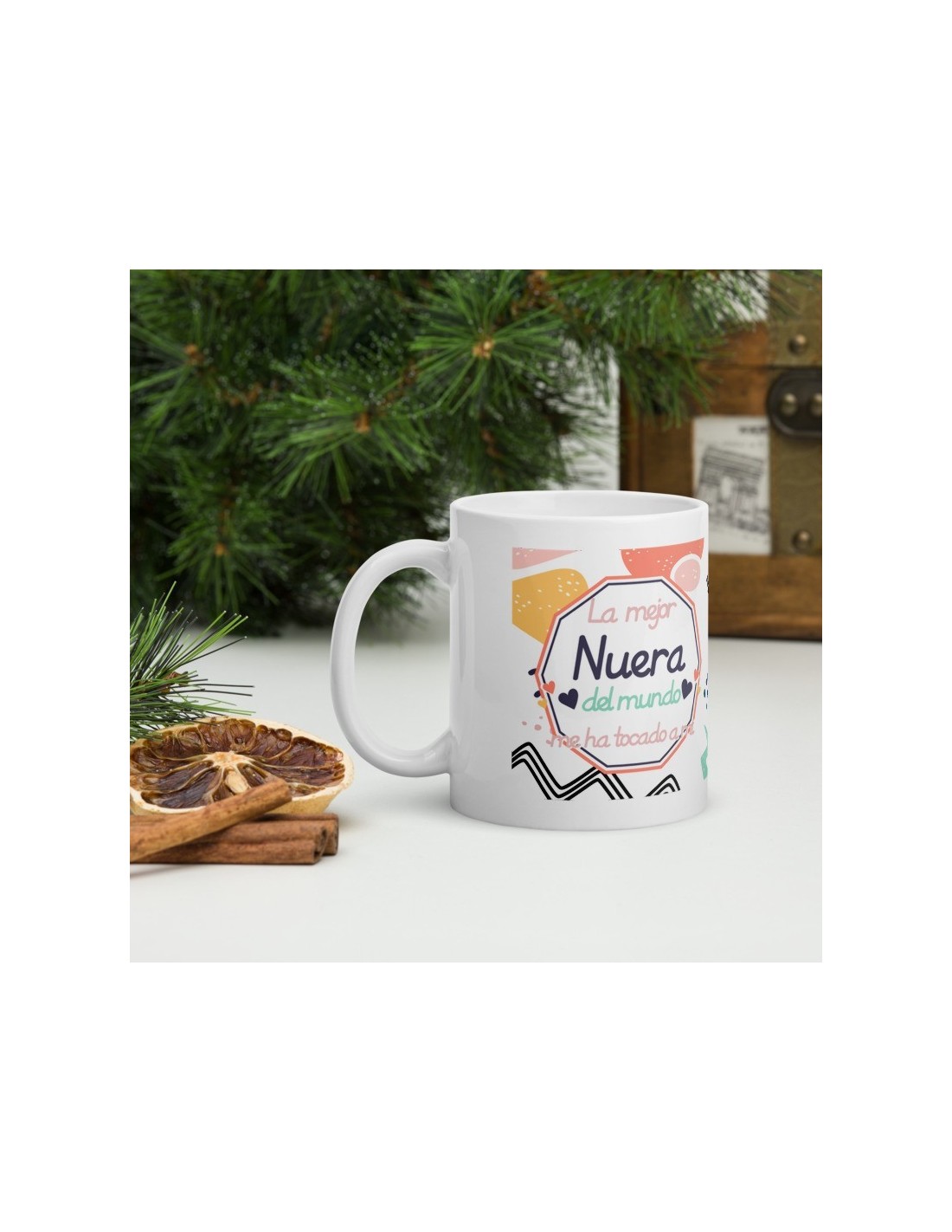 Divertida taza de porcelana decorada con el mensaje "La mejor nuera del mundo me ha tocado a mi".