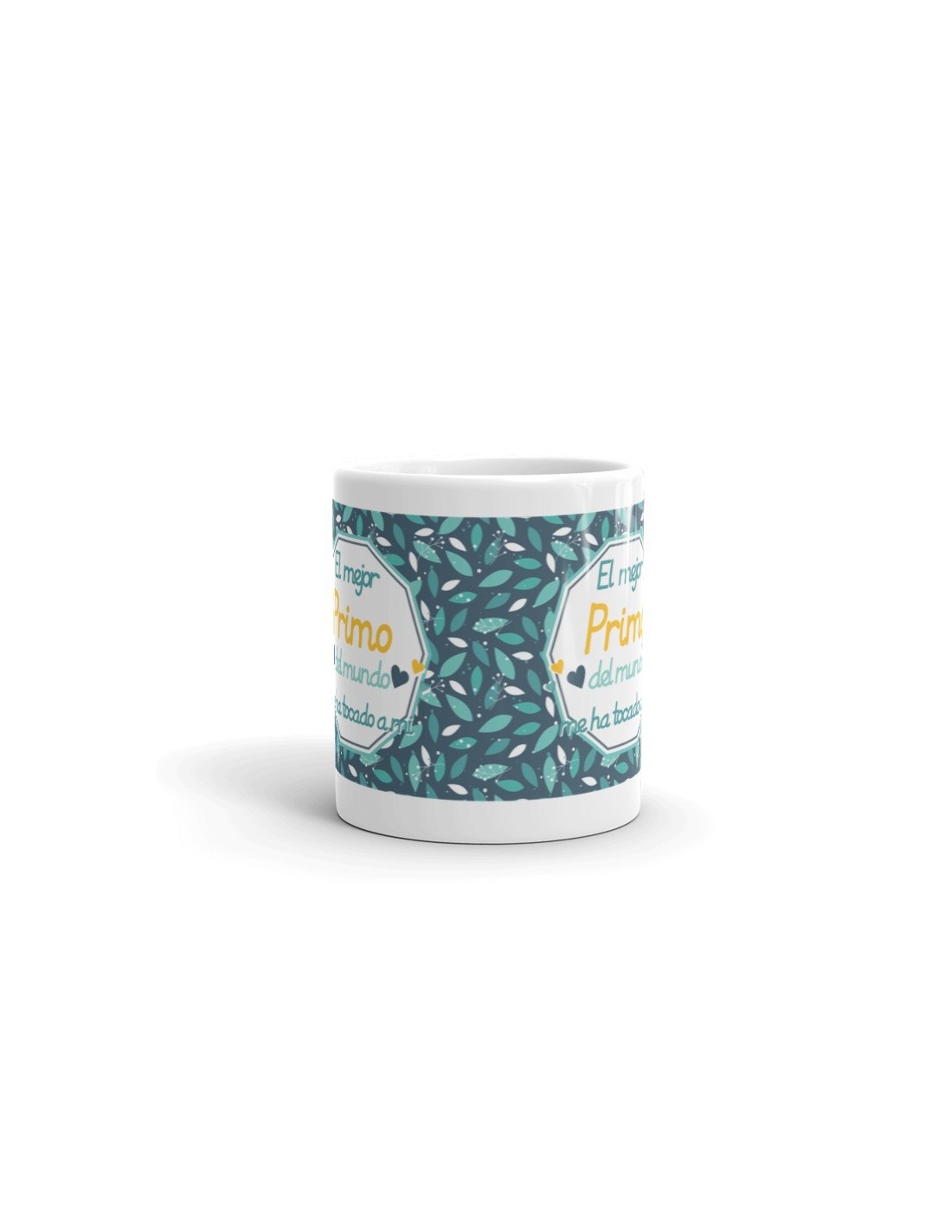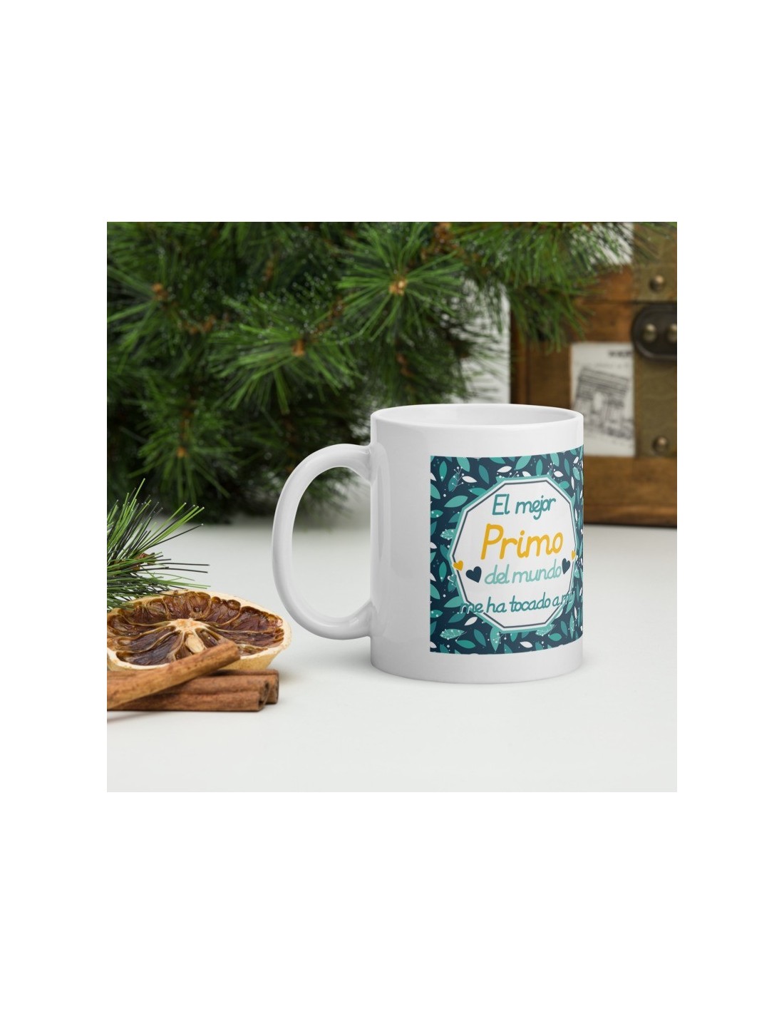 Divertida taza de porcelana decorada con el mensaje "El mejor primo del mundo me ha tocado a mi".