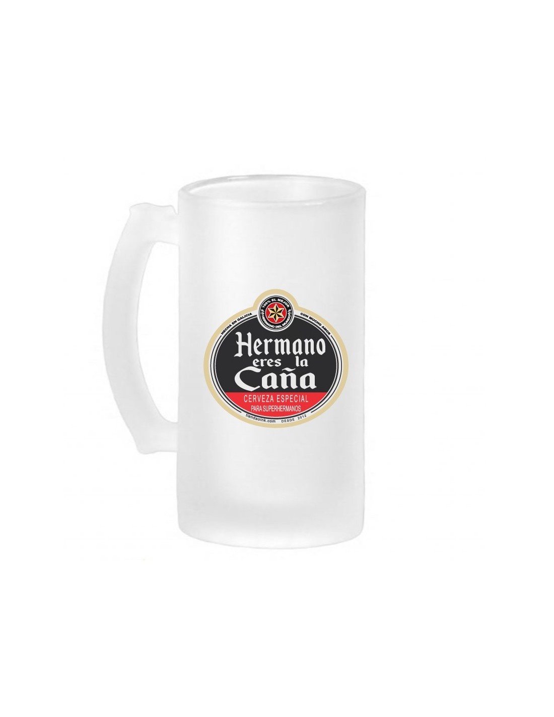 Original jarra de cerveza de vidrio esmerilado decorada con el mensaje "hermano eres la caña".