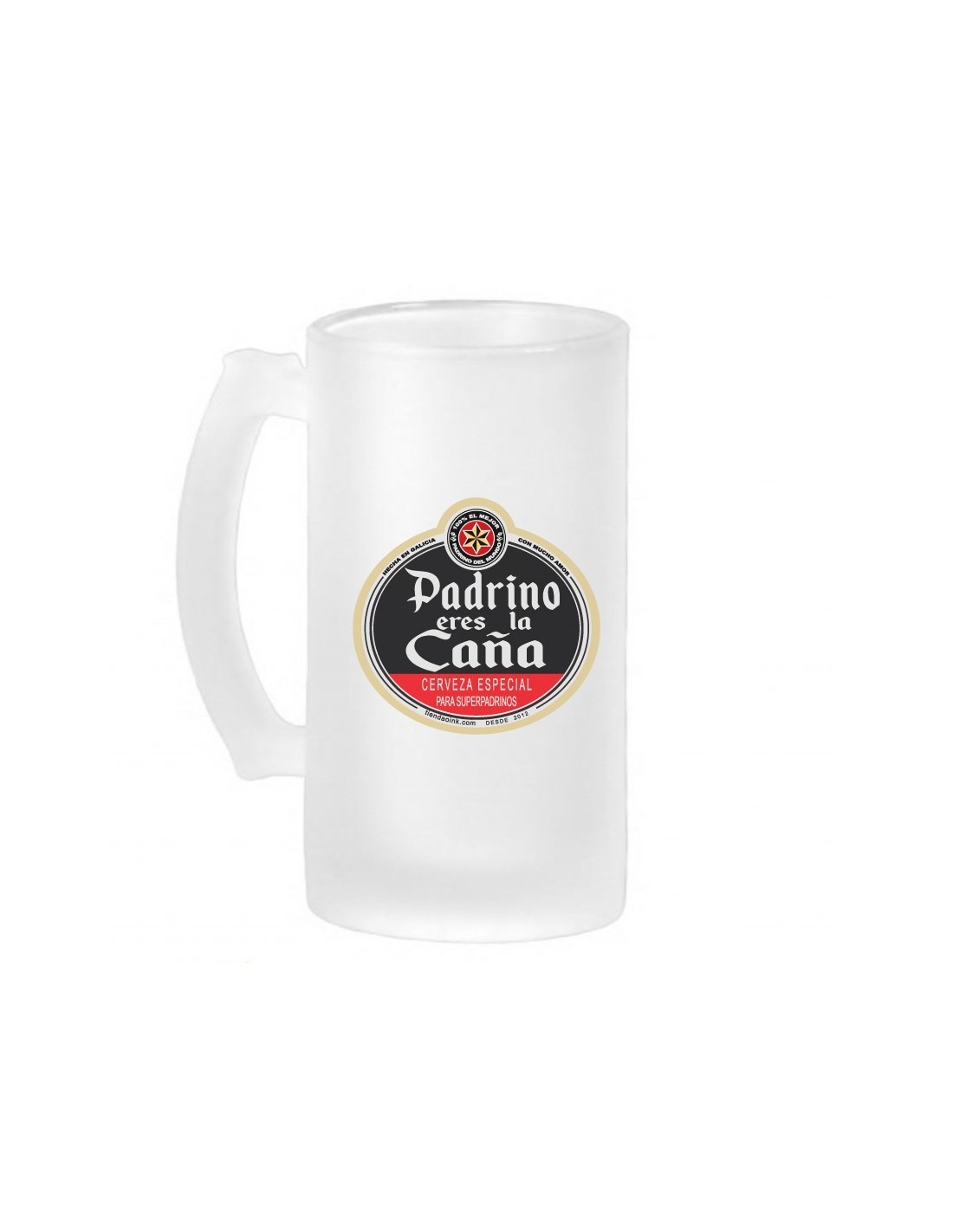 Original jarra de cerveza de vidrio esmerilado decorada con el mensaje "padrino eres la caña".