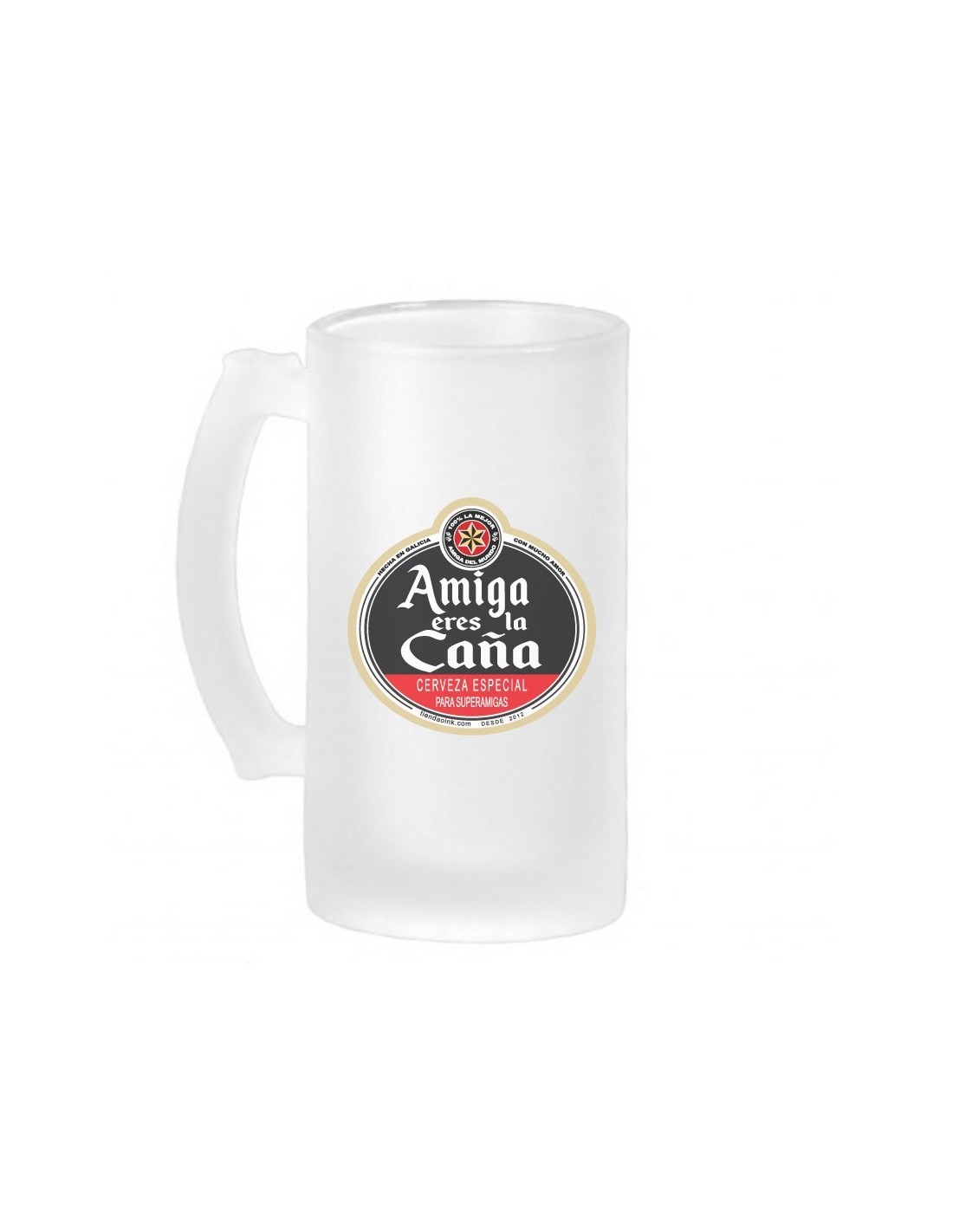 Original jarra de cerveza de vidrio esmerilado decorada con el mensaje "amiga eres la caña".