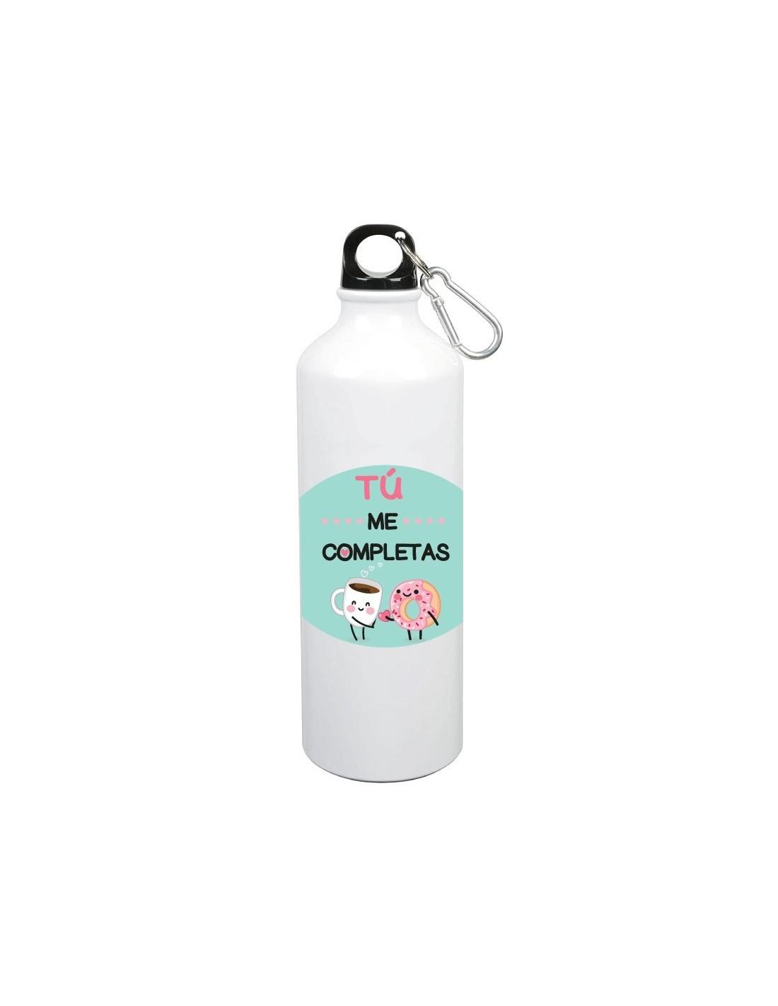 Original botella de aluminio de 800 ml. decorada con el texto "tú me completas".