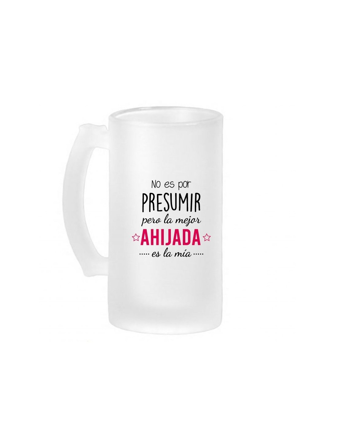 Original jarra de cerveza de vidrio esmerilado decorada con el mensaje "No es por presumir pero la mejor ahijada es la mía".