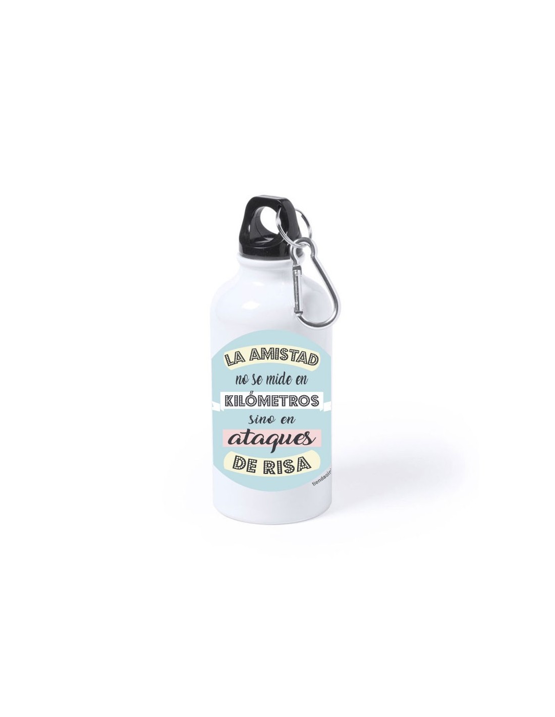 Original botella de aluminio de 400 ml. decorada con el mensaje "la amistad no se mide en kilómetros, sino en ataques de risa".