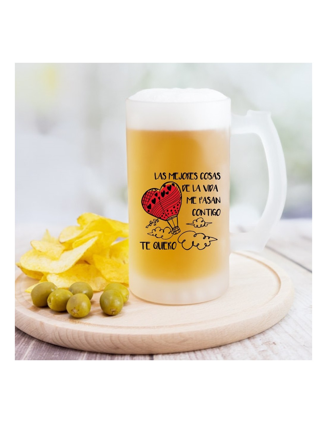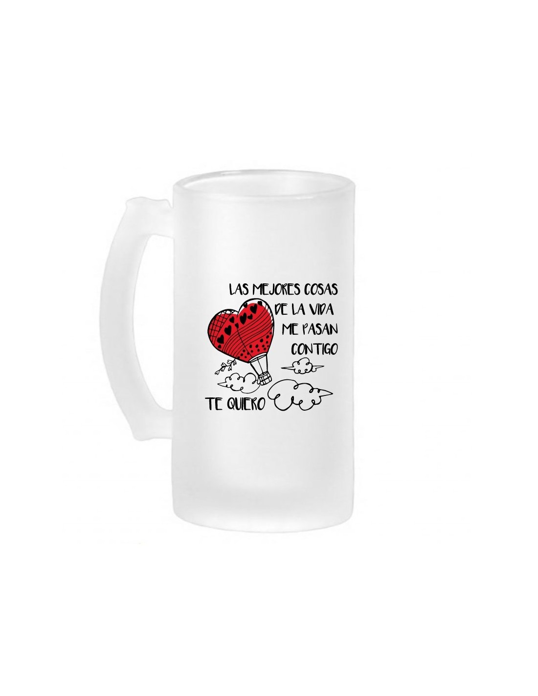 Original jarra de cerveza de vidrio esmerilado con efecto congelado, decorada con el mensaje "las mejores cosas de la vida me pasan contigo".