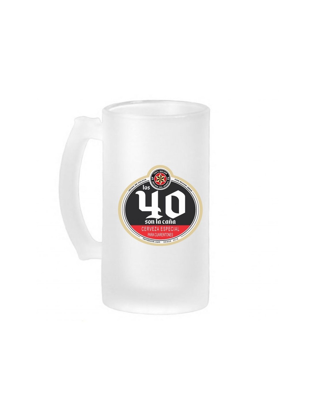 Original jarra de cerveza de vidrio esmerilado decorada con el mensaje "los 40 son la caña".