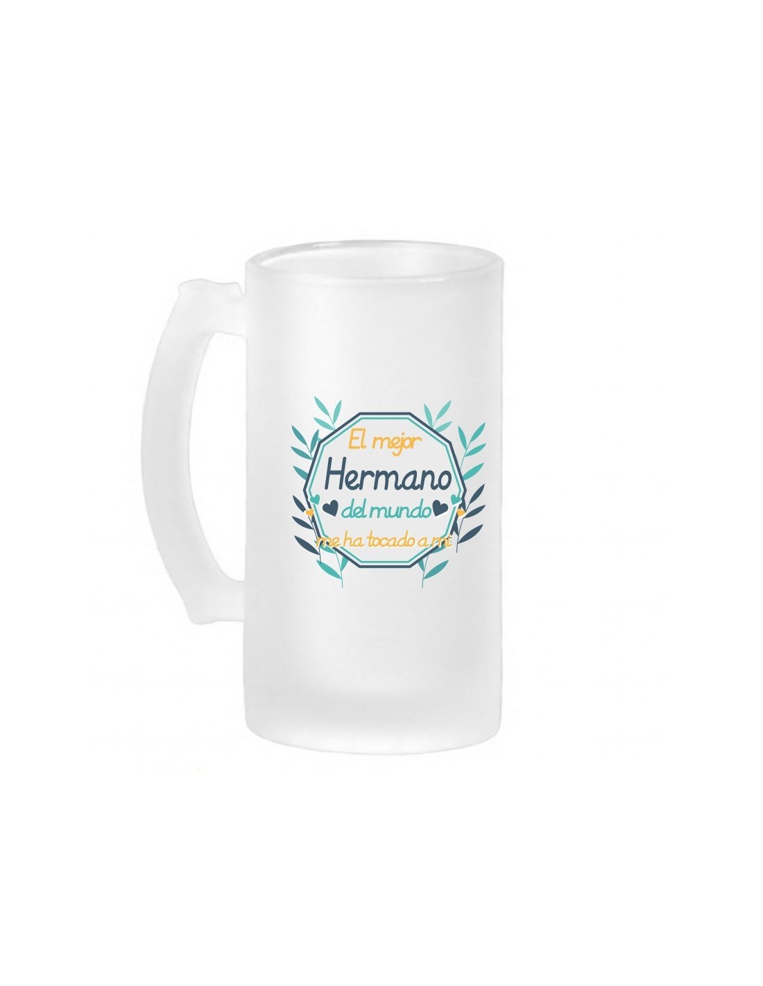 Original jarra de cerveza de vidrio esmerilado decorada con el mensaje "el mejor hermano del mundo me ha tocado a mi".