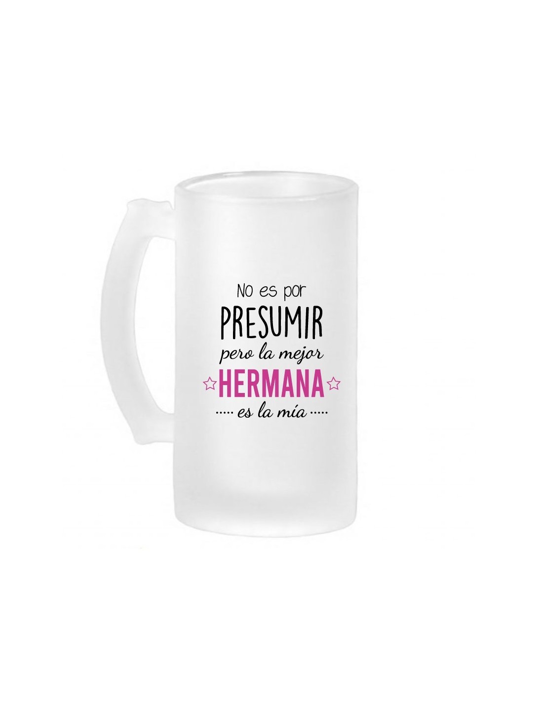Original jarra de cerveza de vidrio esmerilado decorada con el mensaje "no es por presumir pero la mejor hermana es la mía".
