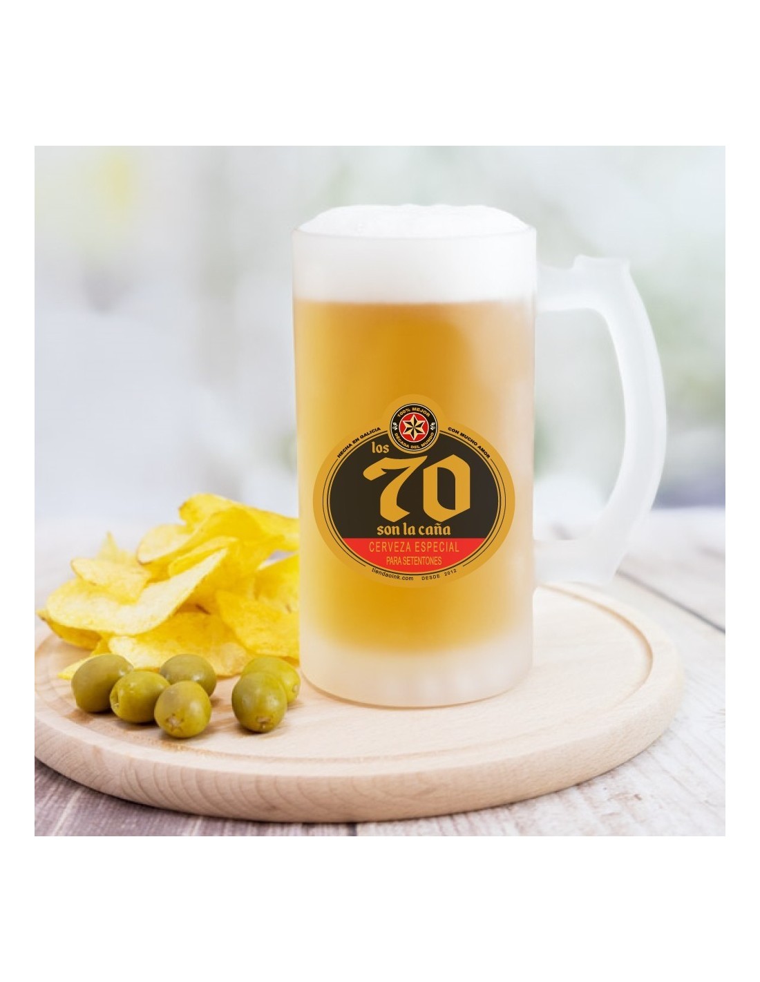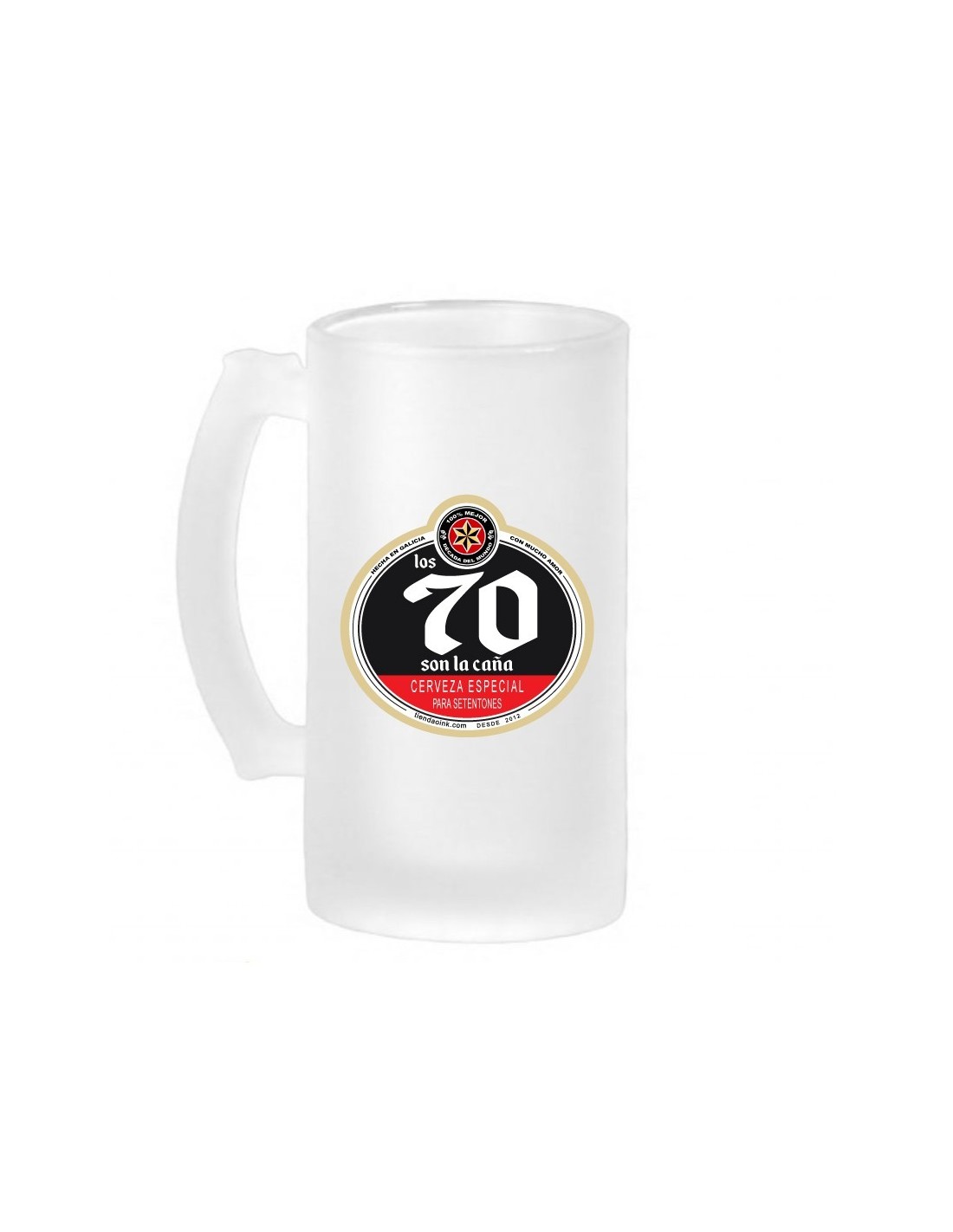 Original jarra de cerveza de vidrio esmerilado decorada con el mensaje "los 70 son la caña".