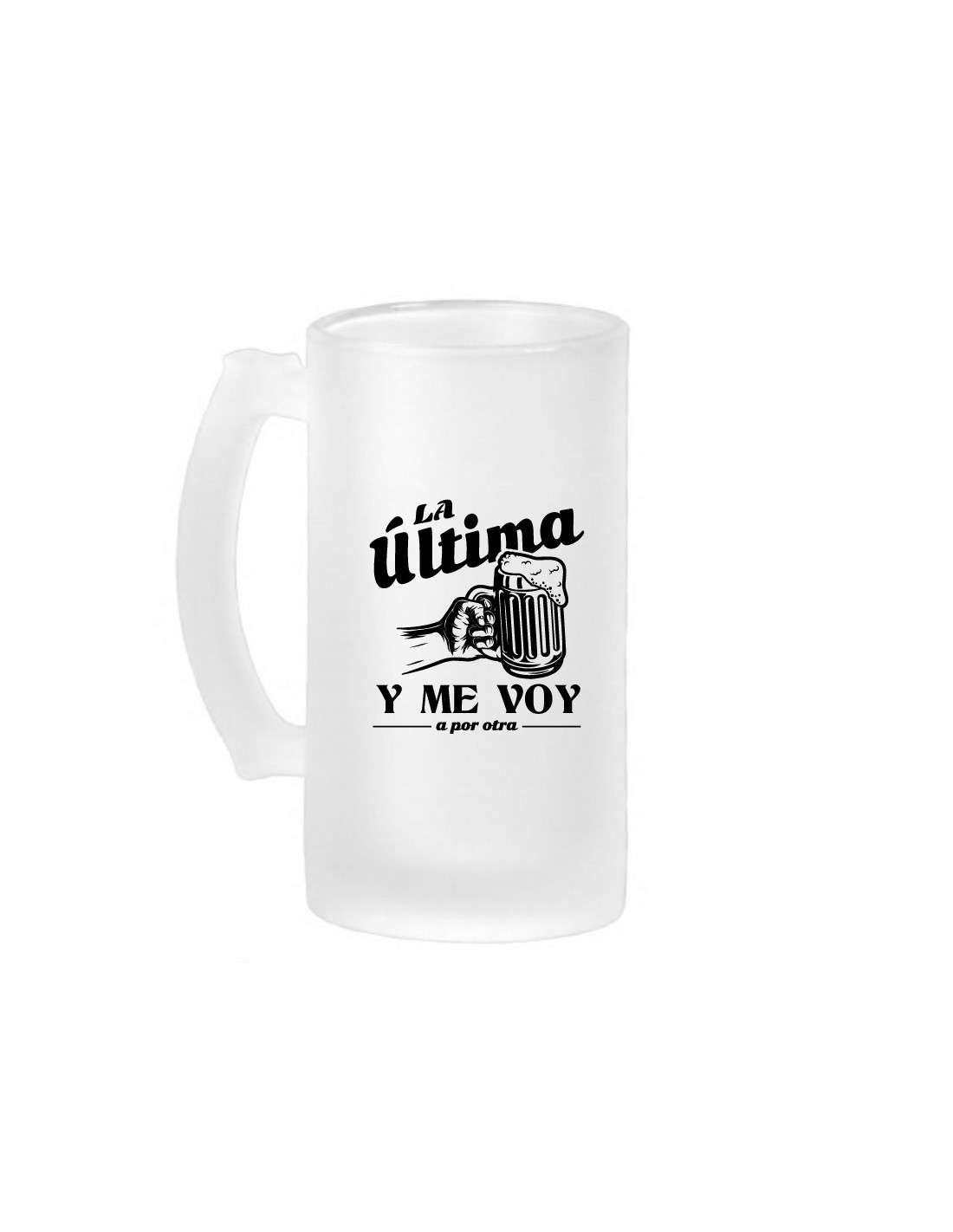 Original jarra de cerveza de vidrio esmerilado decorada con el mensaje "la última y me voy a por otra".