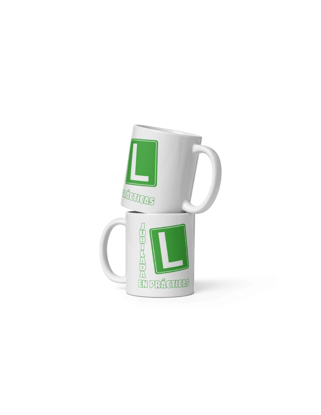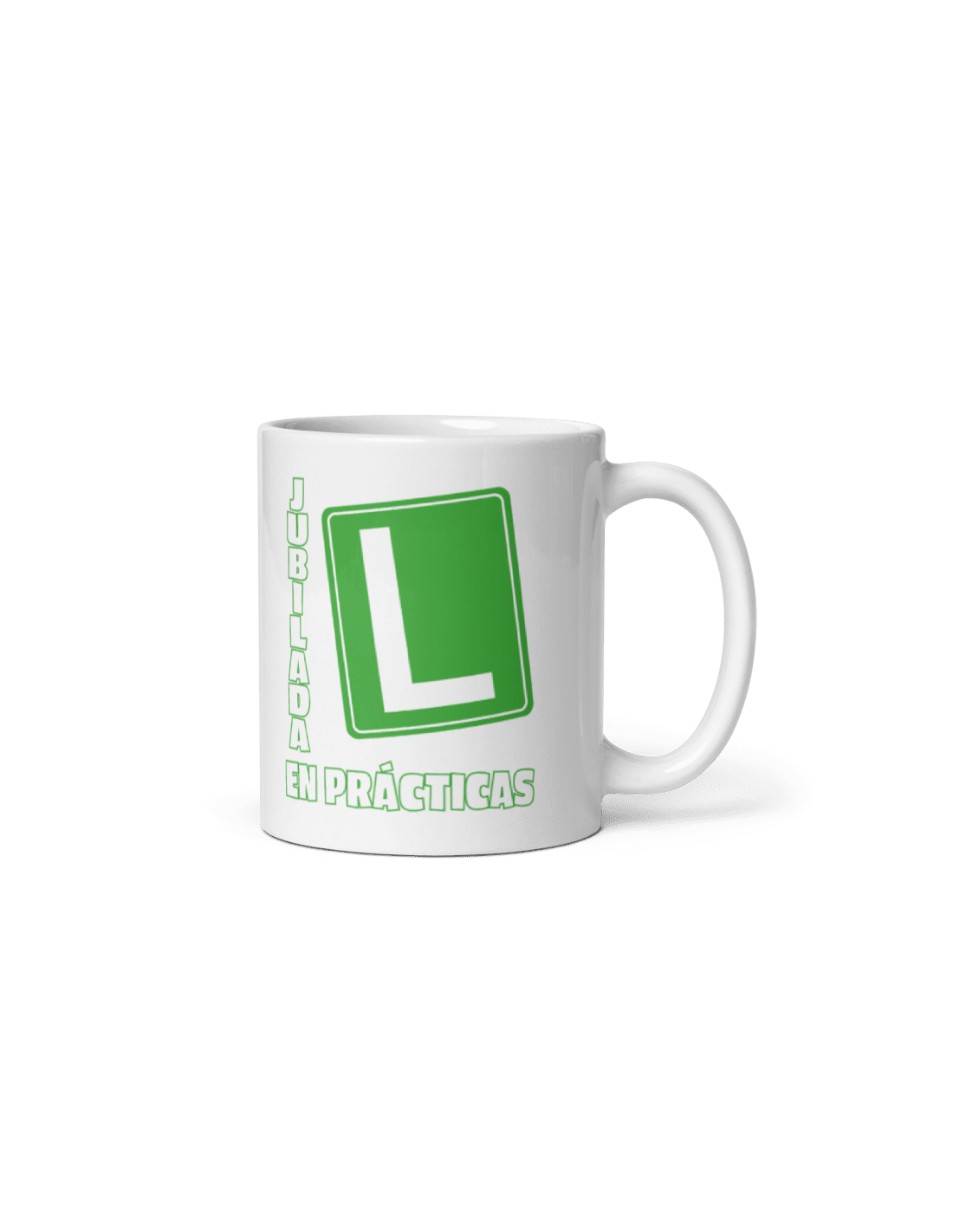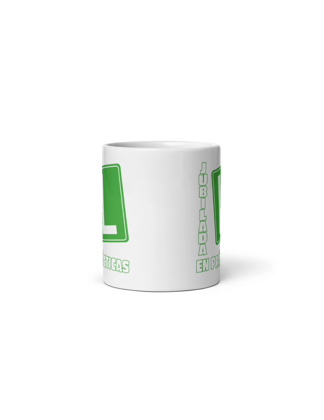 Original taza de porcelana decorada con el mensaje "Jubilada en prácticas".