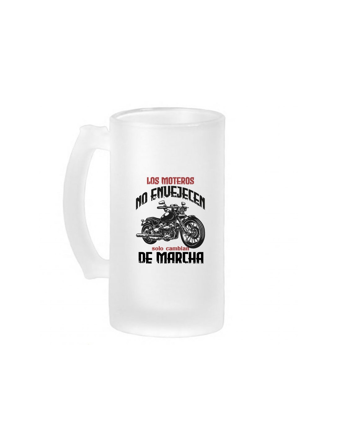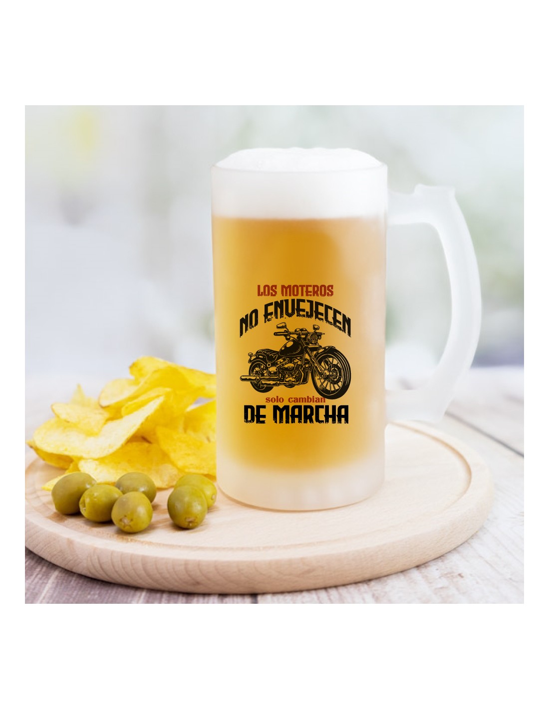 Original jarra de cerveza de vidrio esmerilado decorada con el mensaje "Los moteros no envejecen solo cambian de marcha".