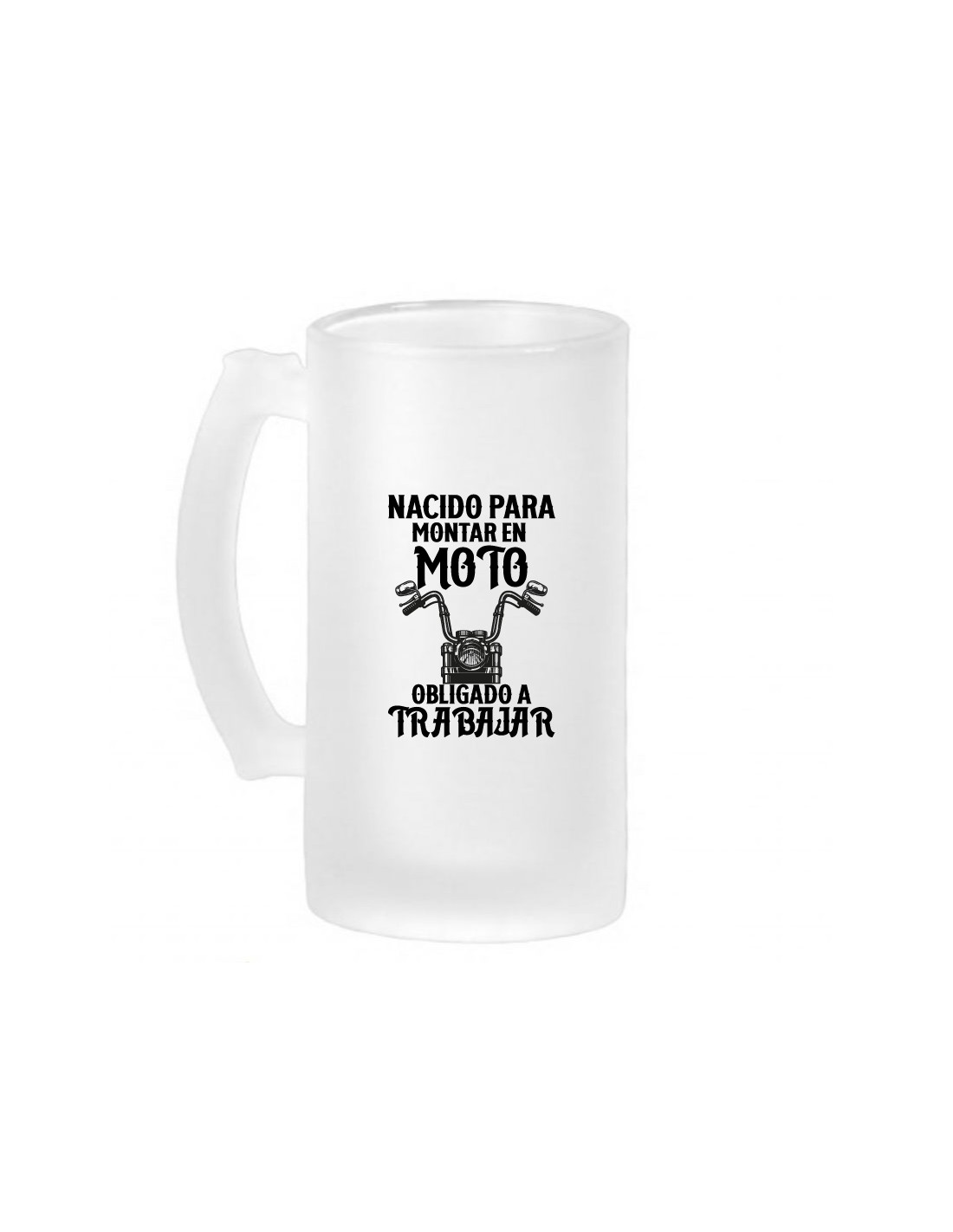 Original jarra de cerveza de vidrio esmerilado decorada con el mensaje "nacido para montar en moto, obligado a trabajar".