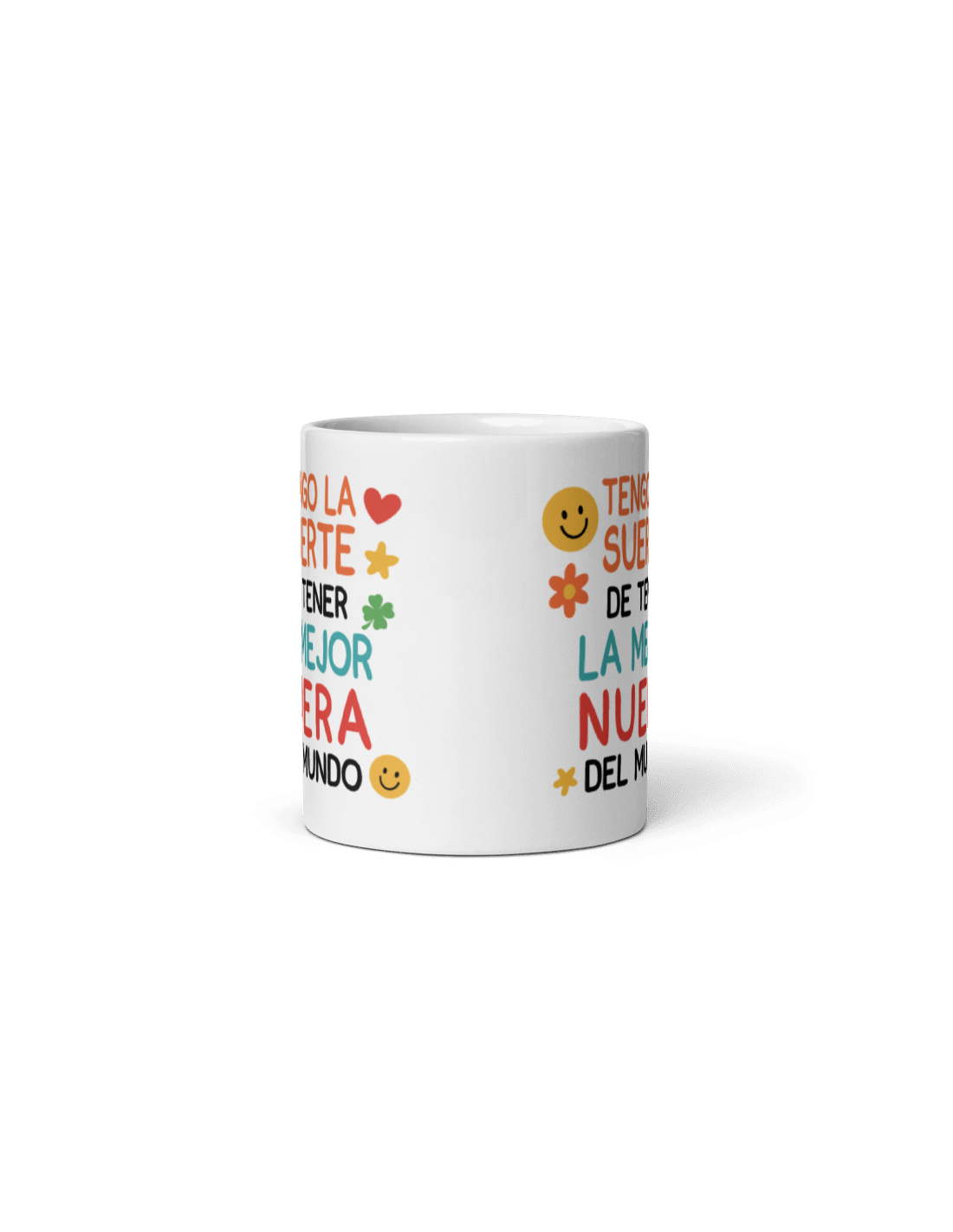 Original taza de porcelana decorada con el mensaje "Tengo la suerte de tener la mejor nuera del mundo".