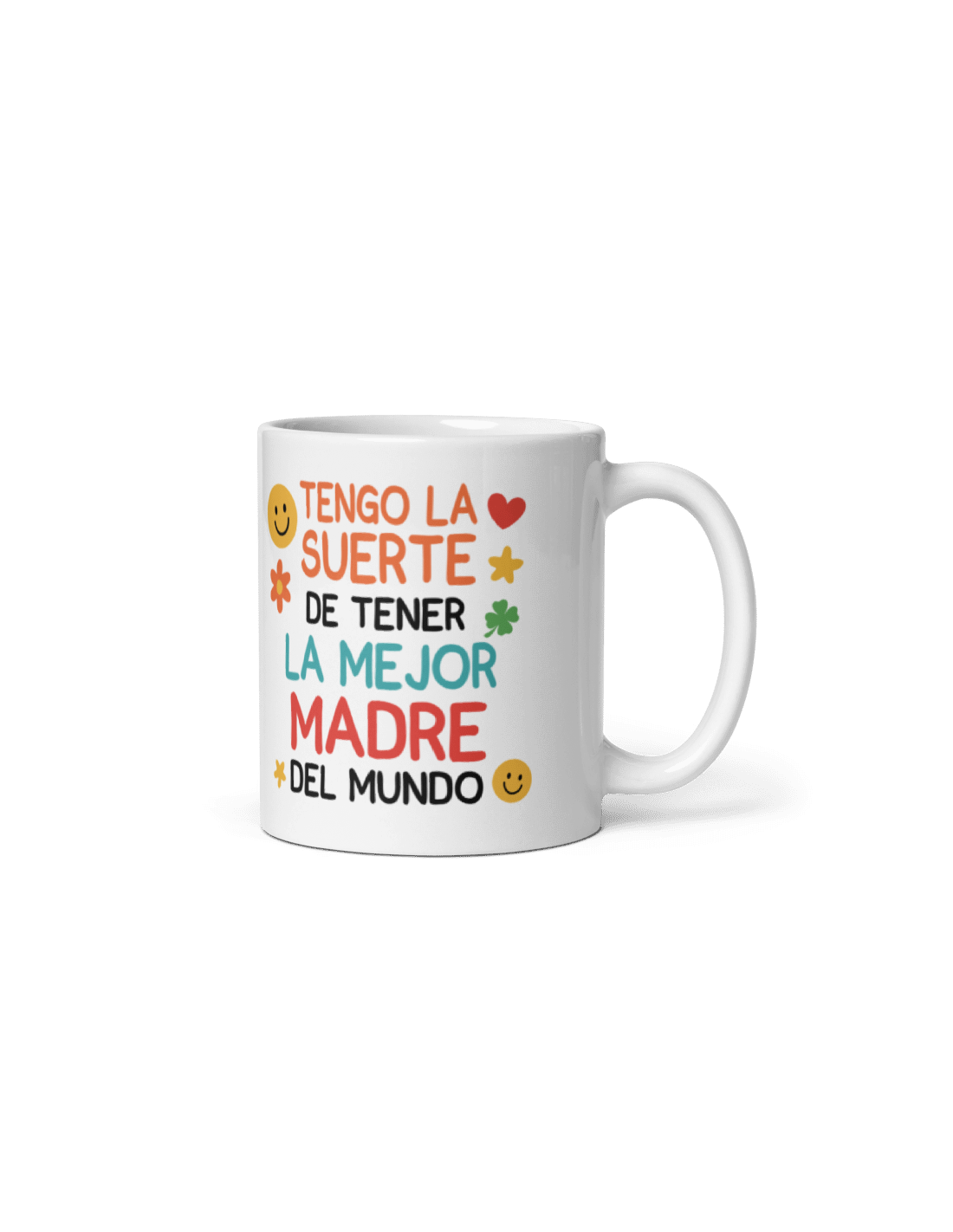Original taza de porcelana decorada con el mensaje "Tengo la suerte de tener la mejor madre del mundo".