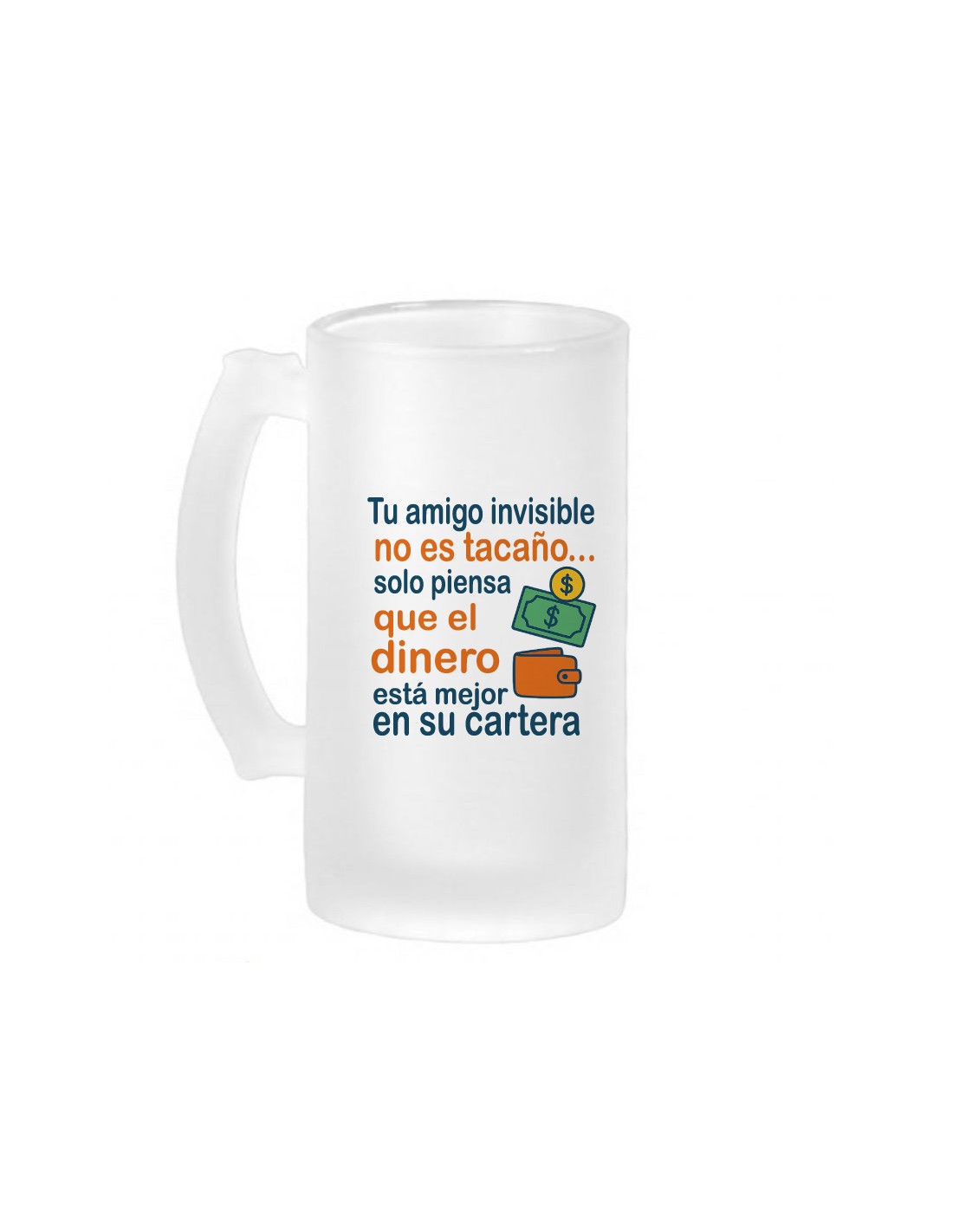 Original jarra de cerveza de vidrio esmerilado con efecto congelado, decorada con el mensaje "Tu amigo invisible no es tacaño...solo piensa que el dinero está mejor en su cartera".