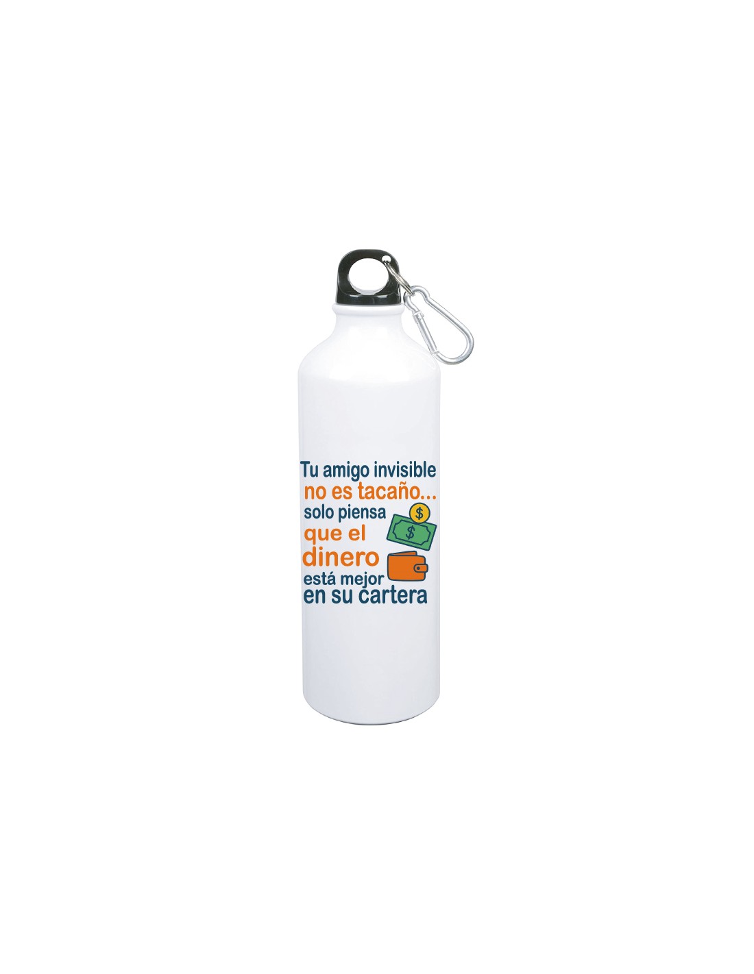 Original botella de aluminio de 800 ml. decorada con el texto "tu amigo invisible no es tacaño... solo piensa que el dinero está mejor en su cartera.