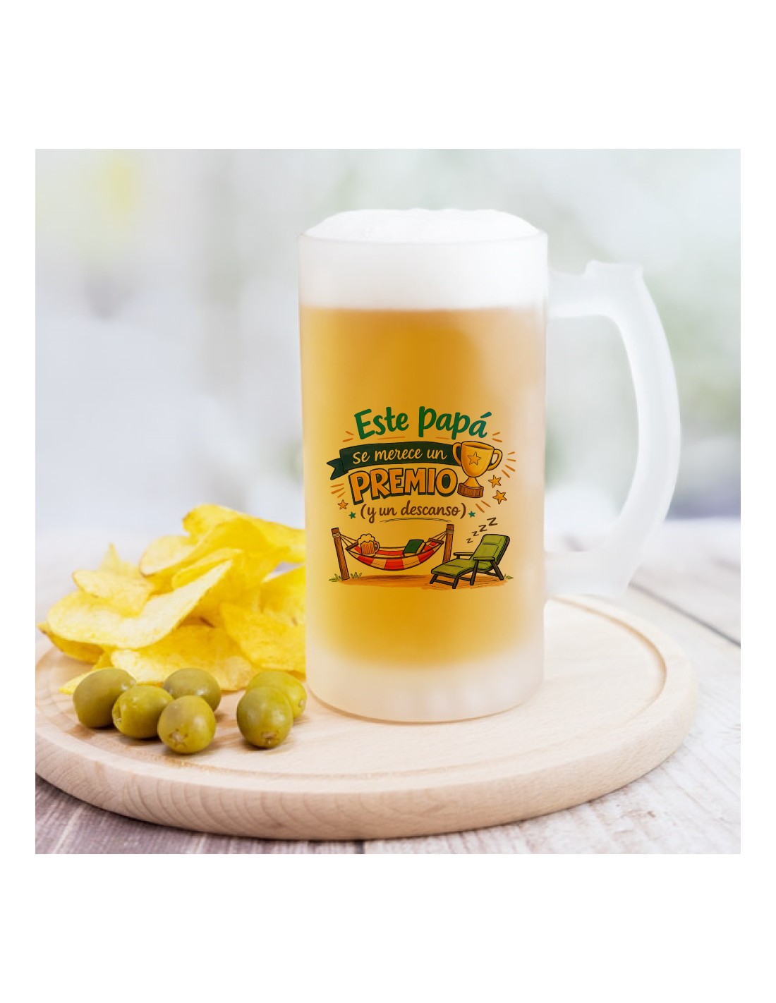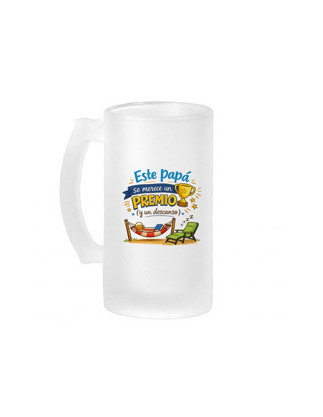 Original jarra de cerveza de vidrio esmerilado decorada con el mensaje "este papá se merece un premio (y un descanso)".