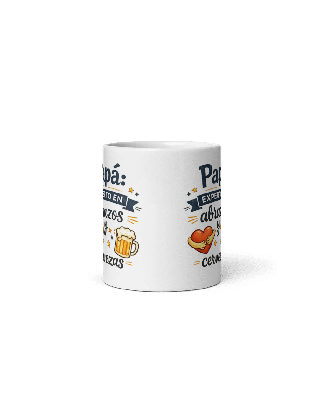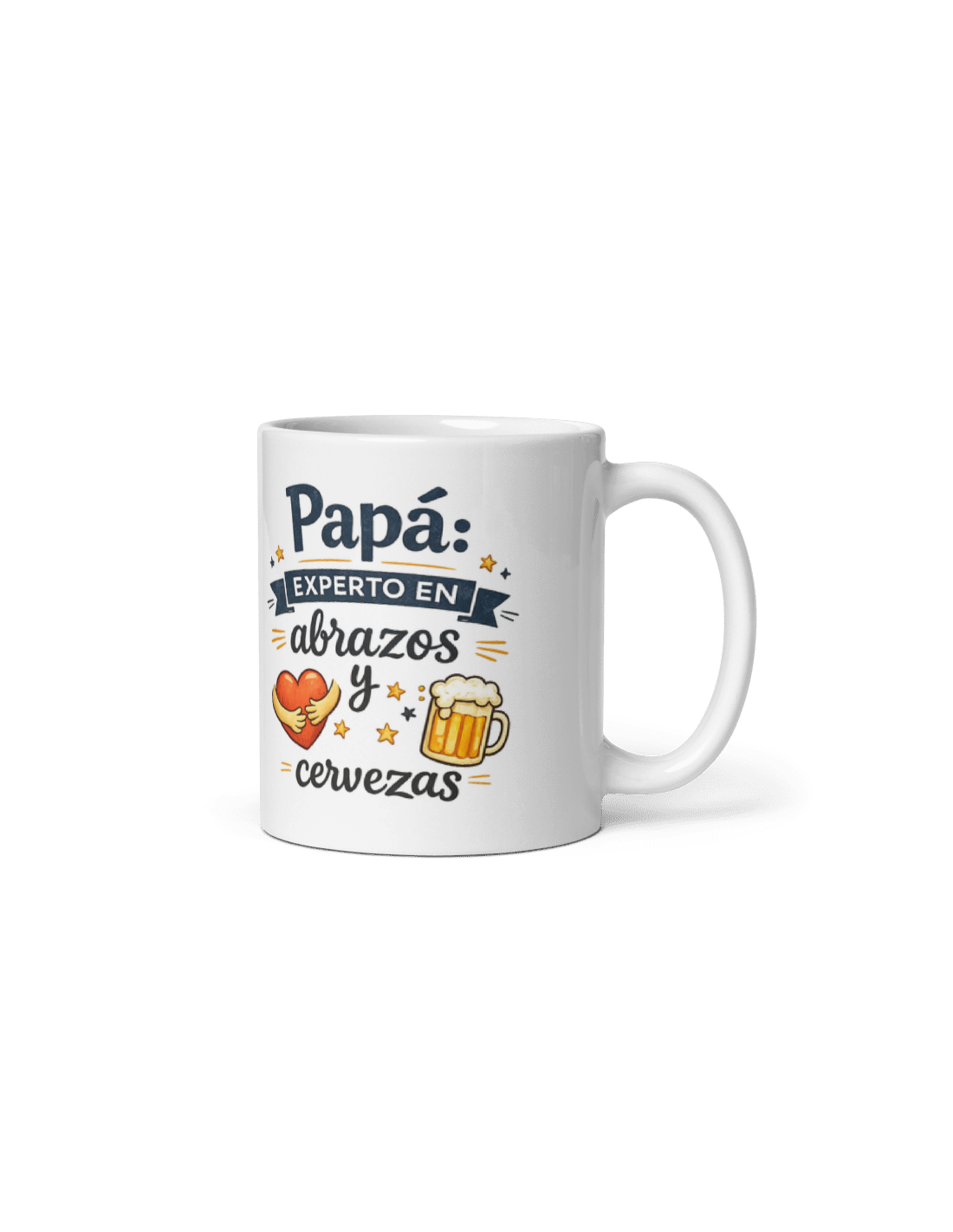 Original taza de porcelana blanca con asa, decorada con mensaje para la "Papá: experto en abrazos y cervezas".
