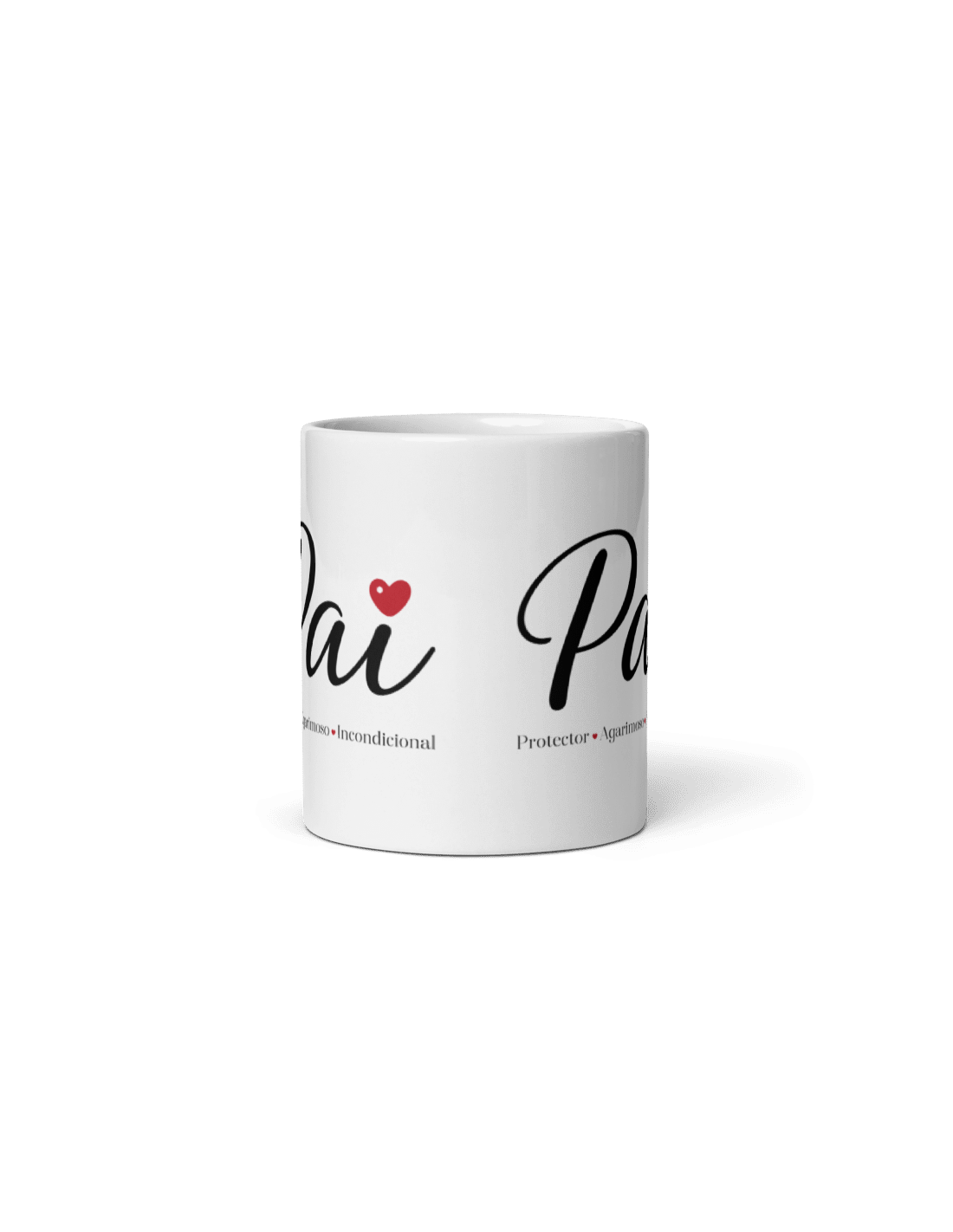 Original taza de porcelana blanca con asa, decorada con el mensaje en gallego "pai: protector, agarimoso, incondicional".