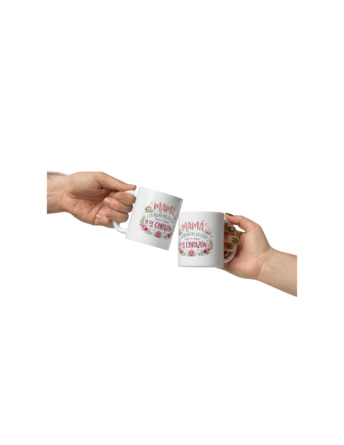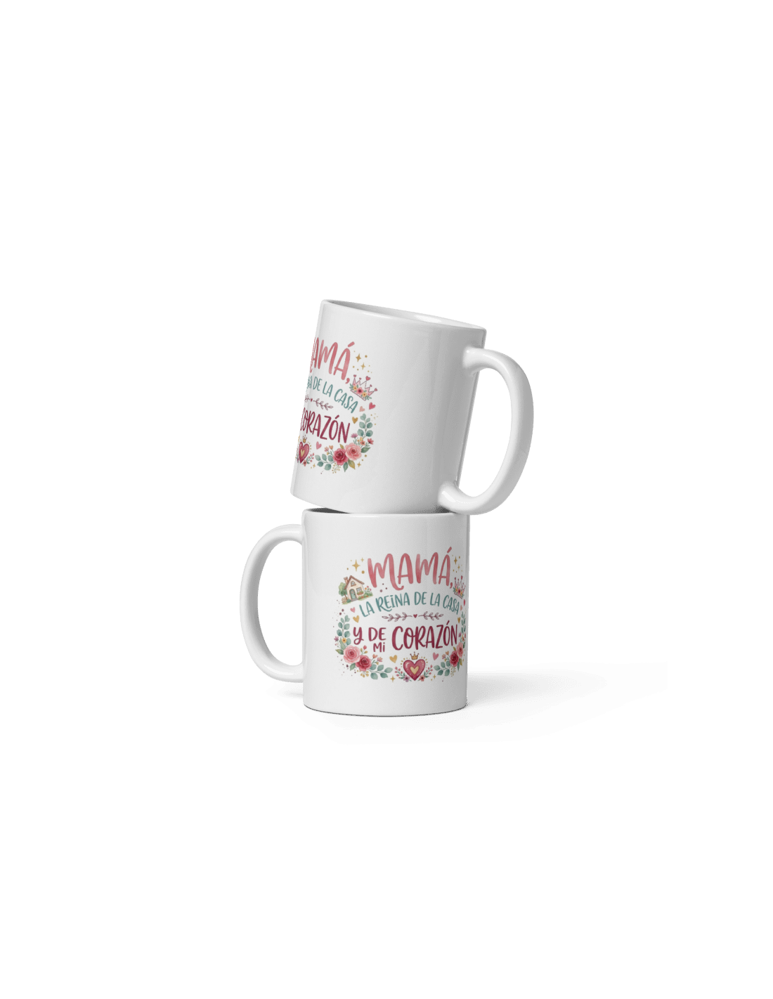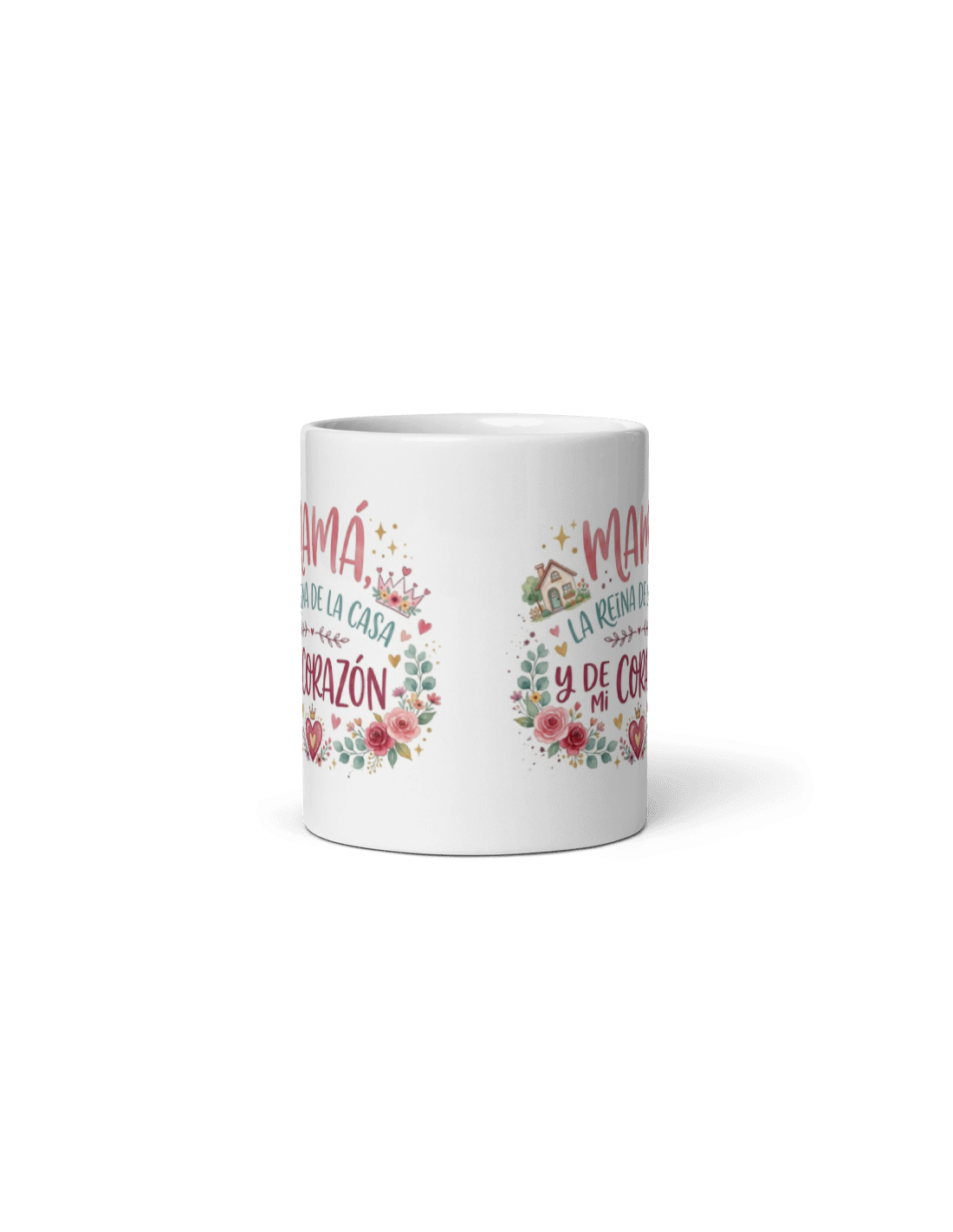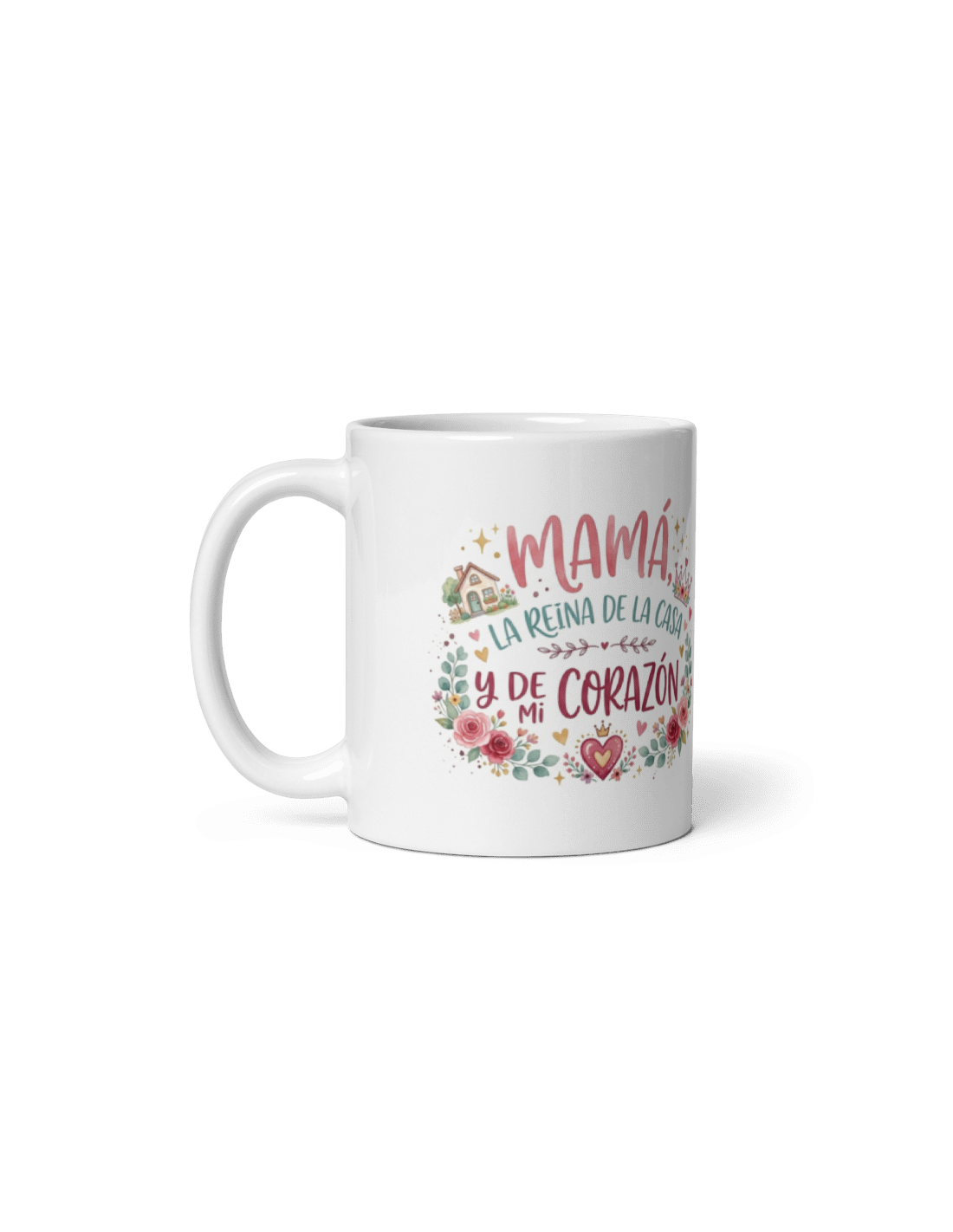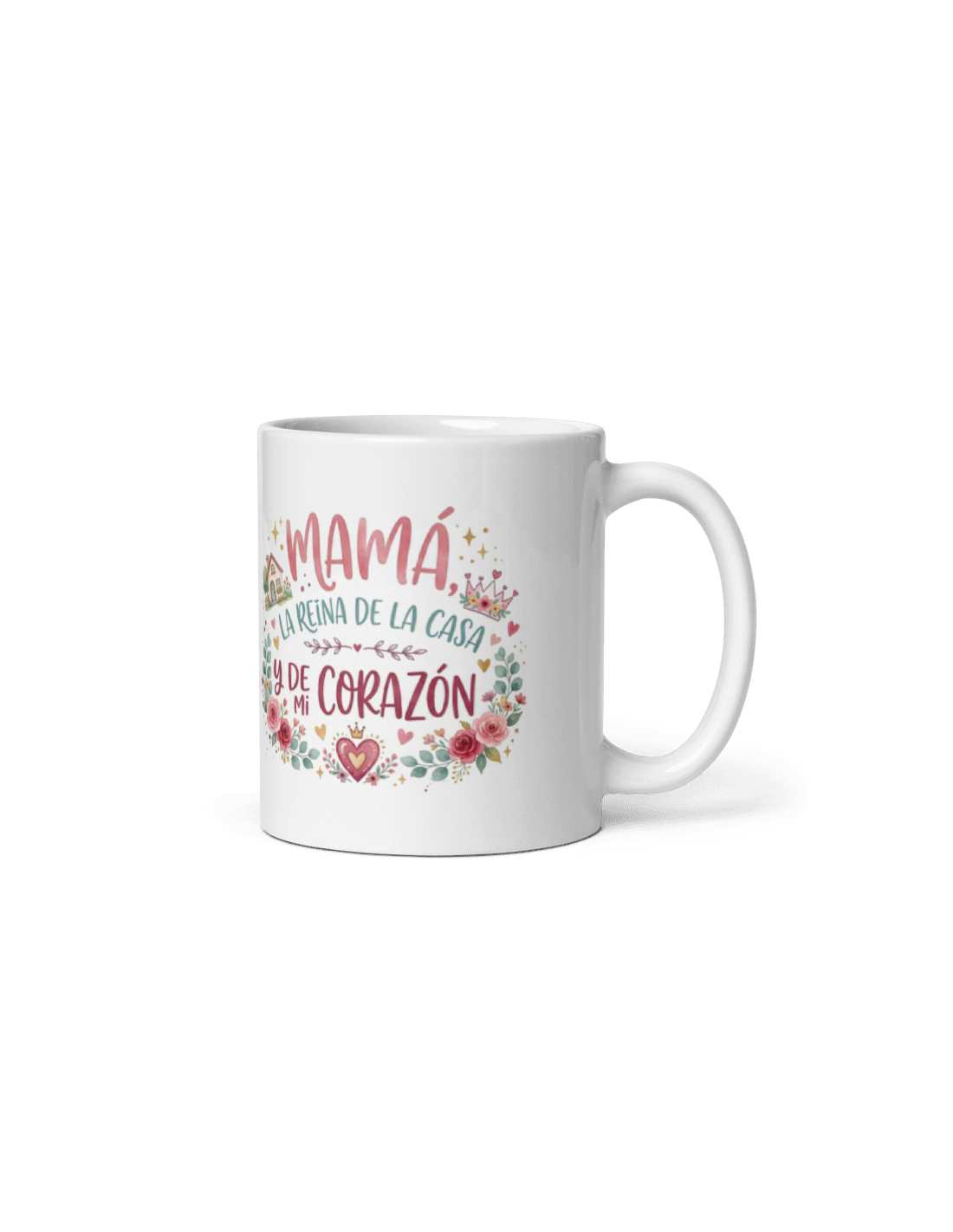 Original taza de porcelana blanca con asa, decorada con mensaje "Mamá la reina de la casa y de mi corazón".