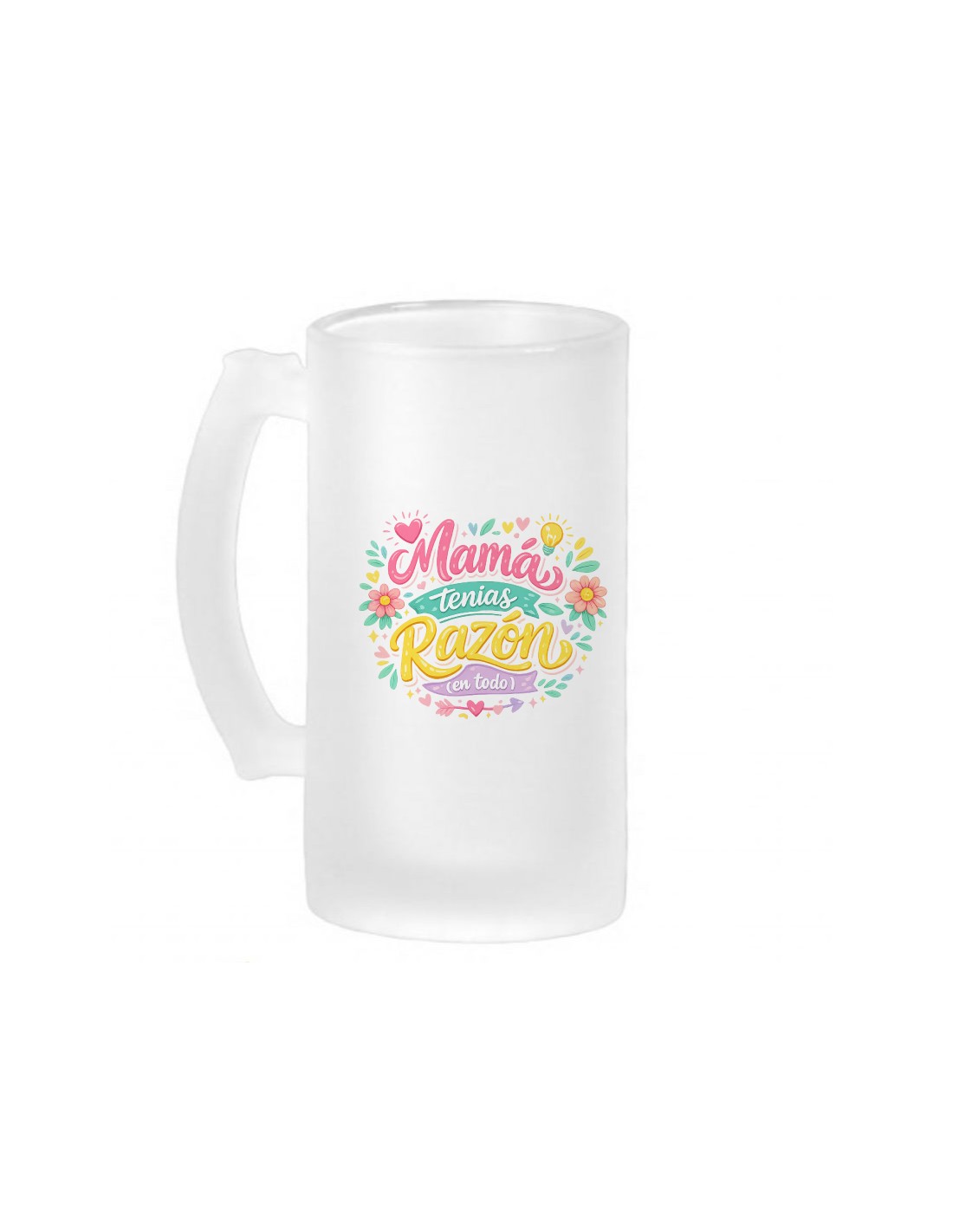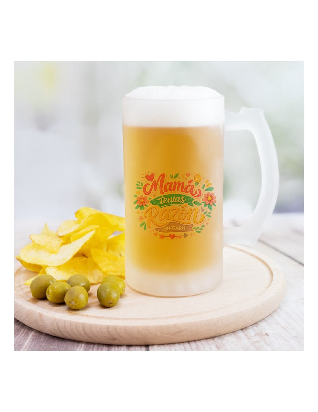 Original jarra de cerveza de vidrio esmerilado decorada con mensaje "Mamá tenías razón en todo".