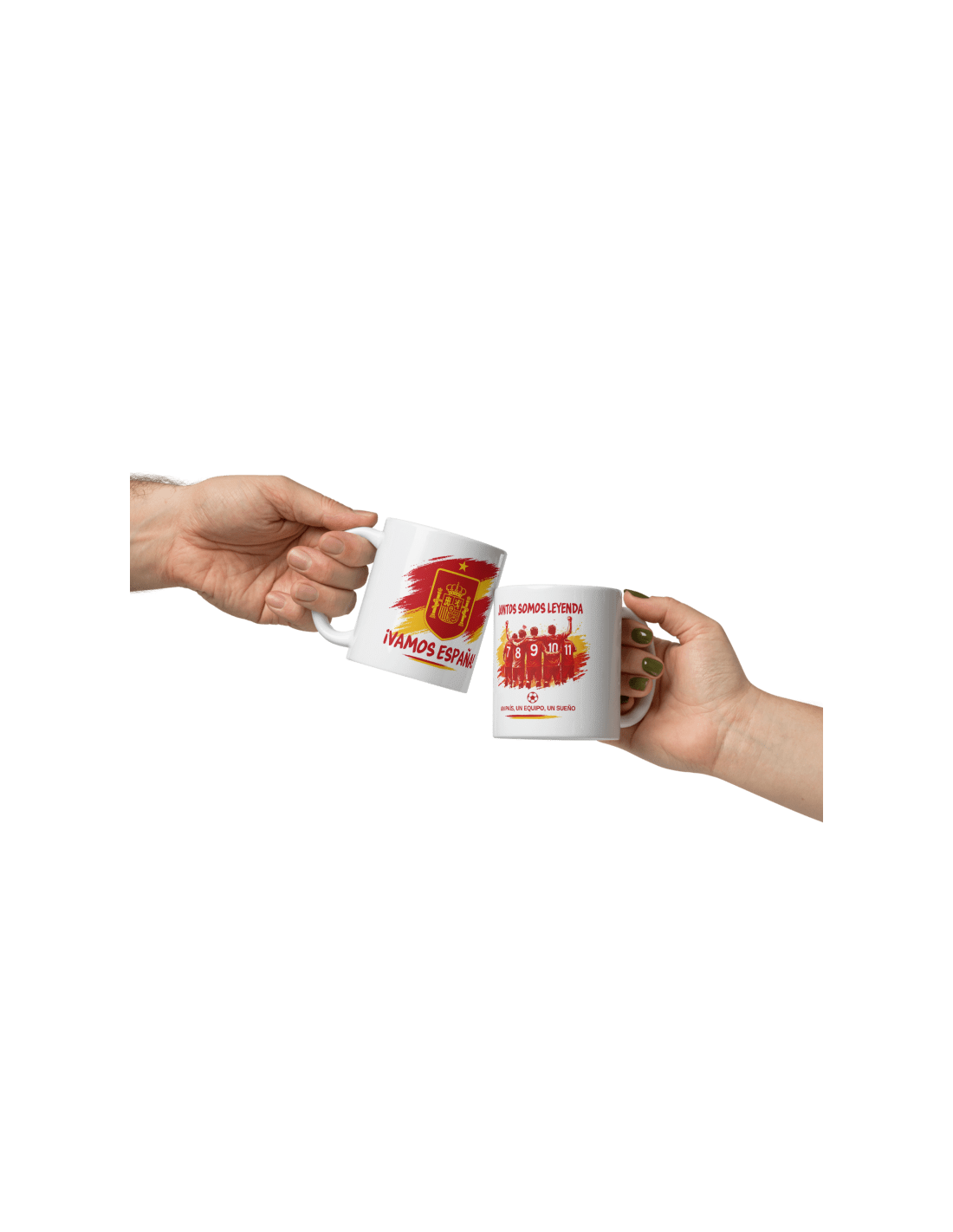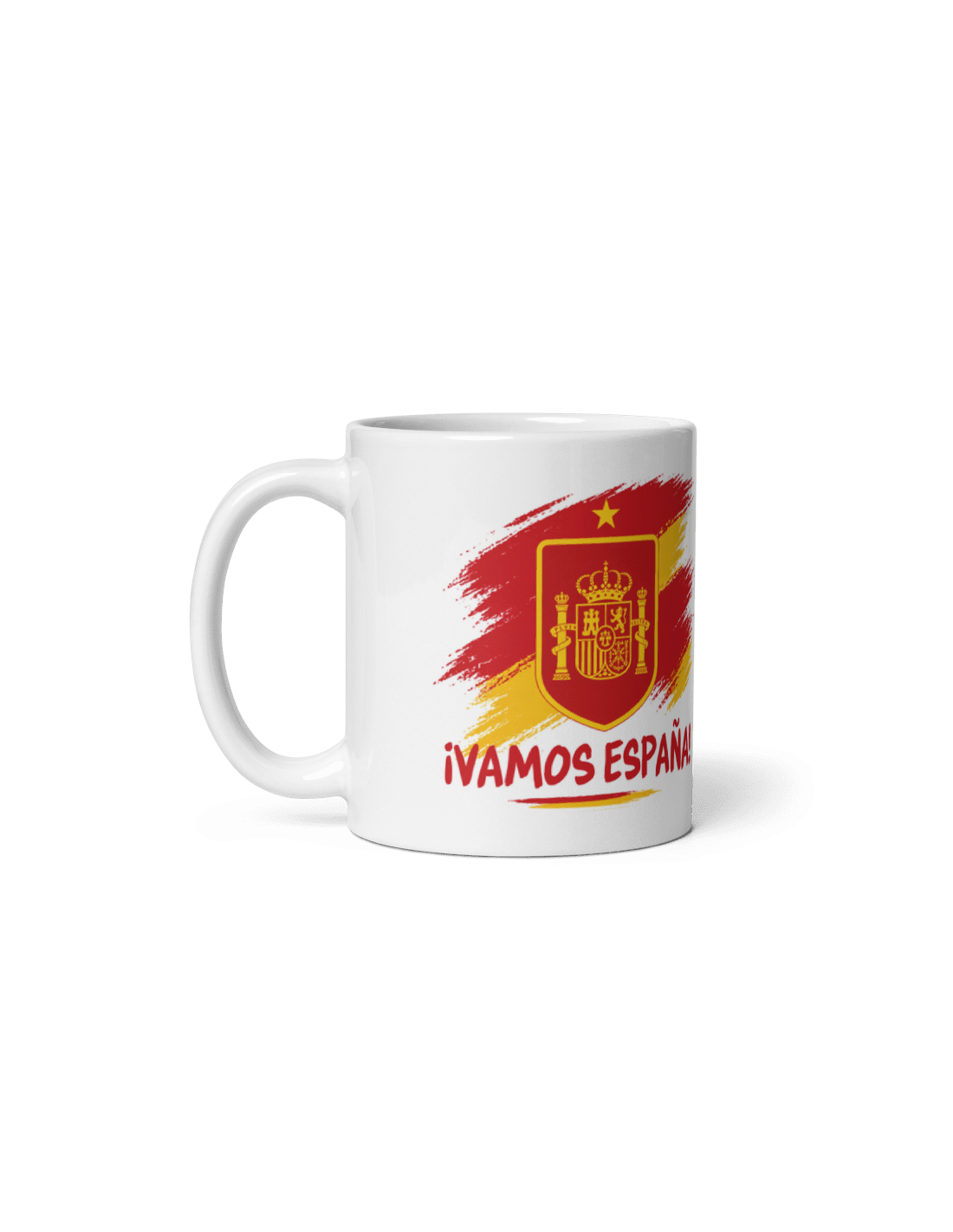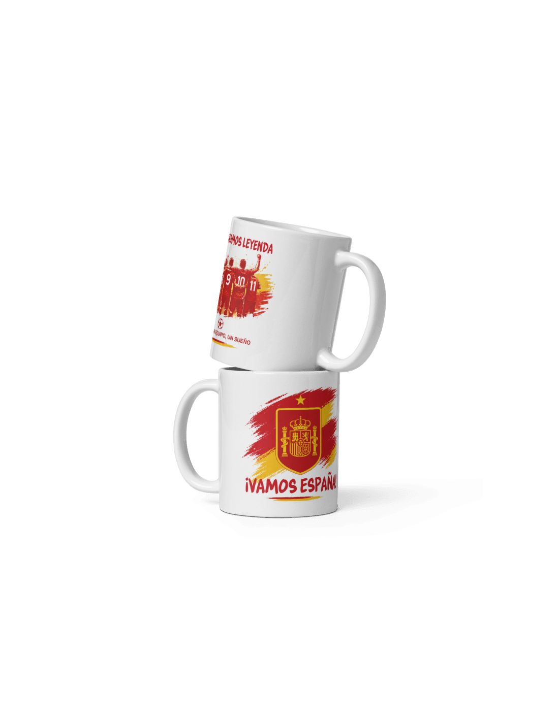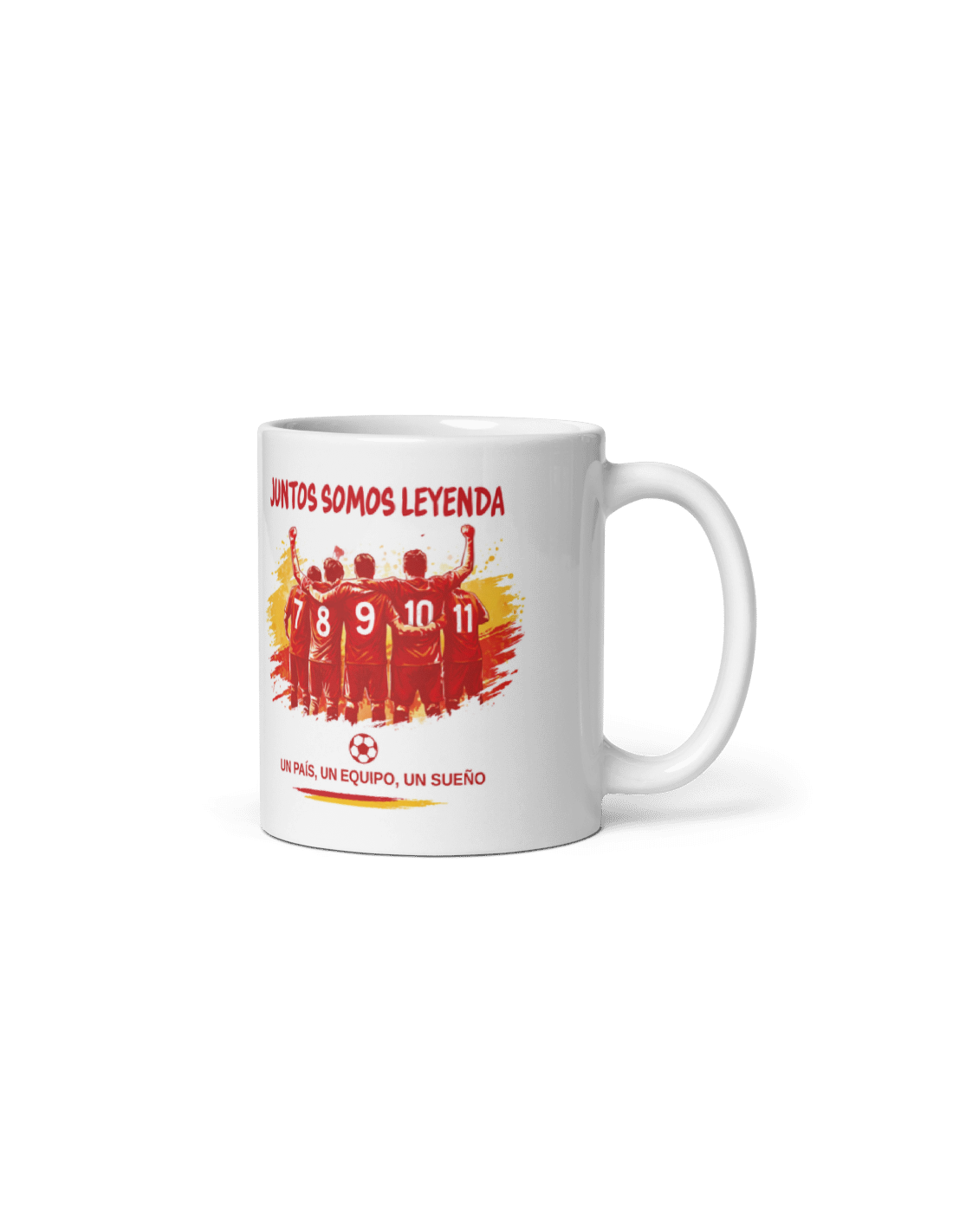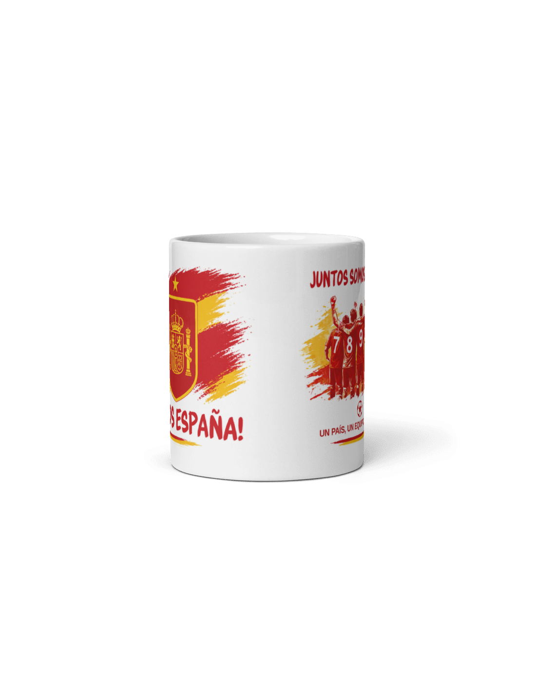 Divertida taza de porcelana blanca con asa decorada con motivos de la selección española de fútbol.