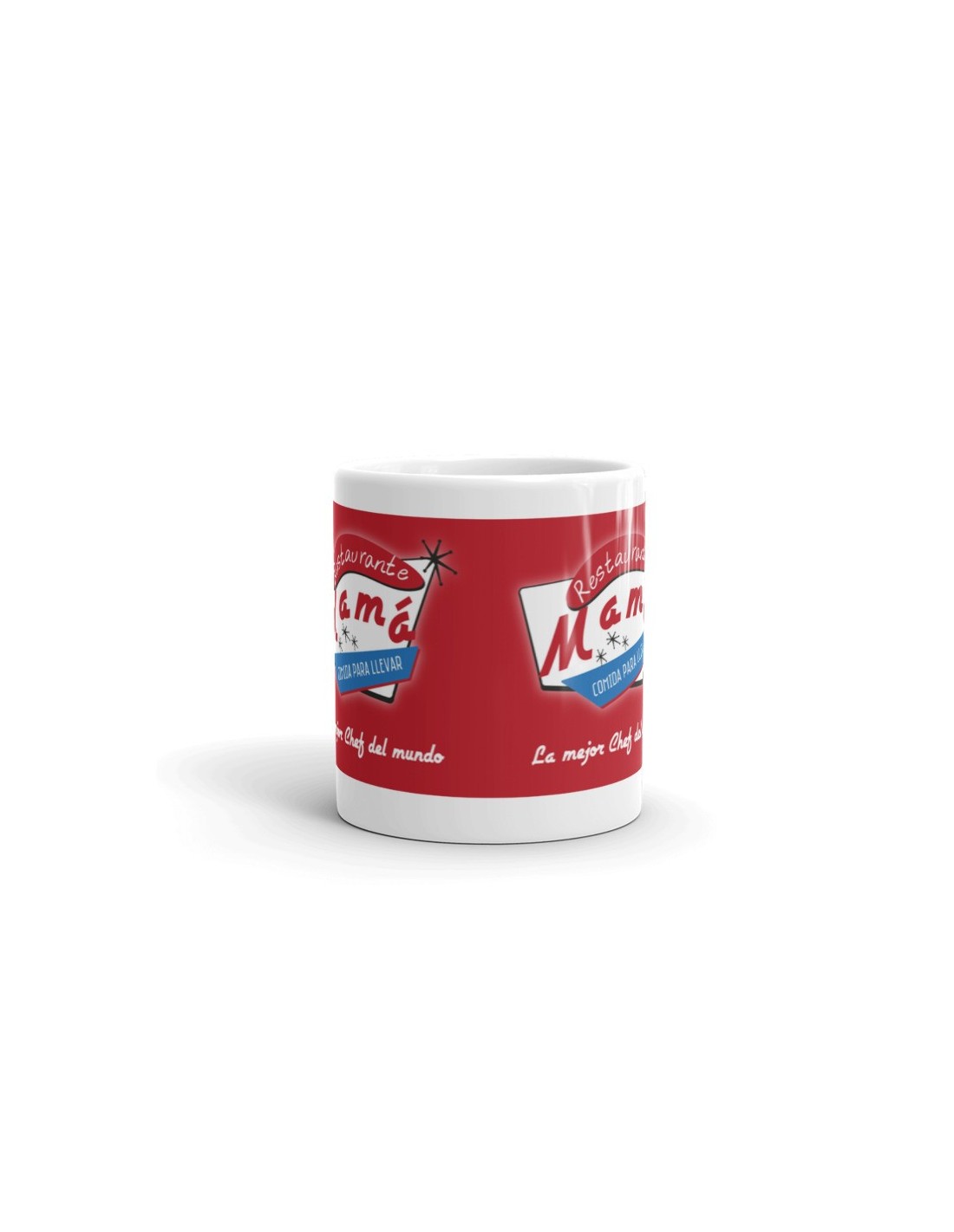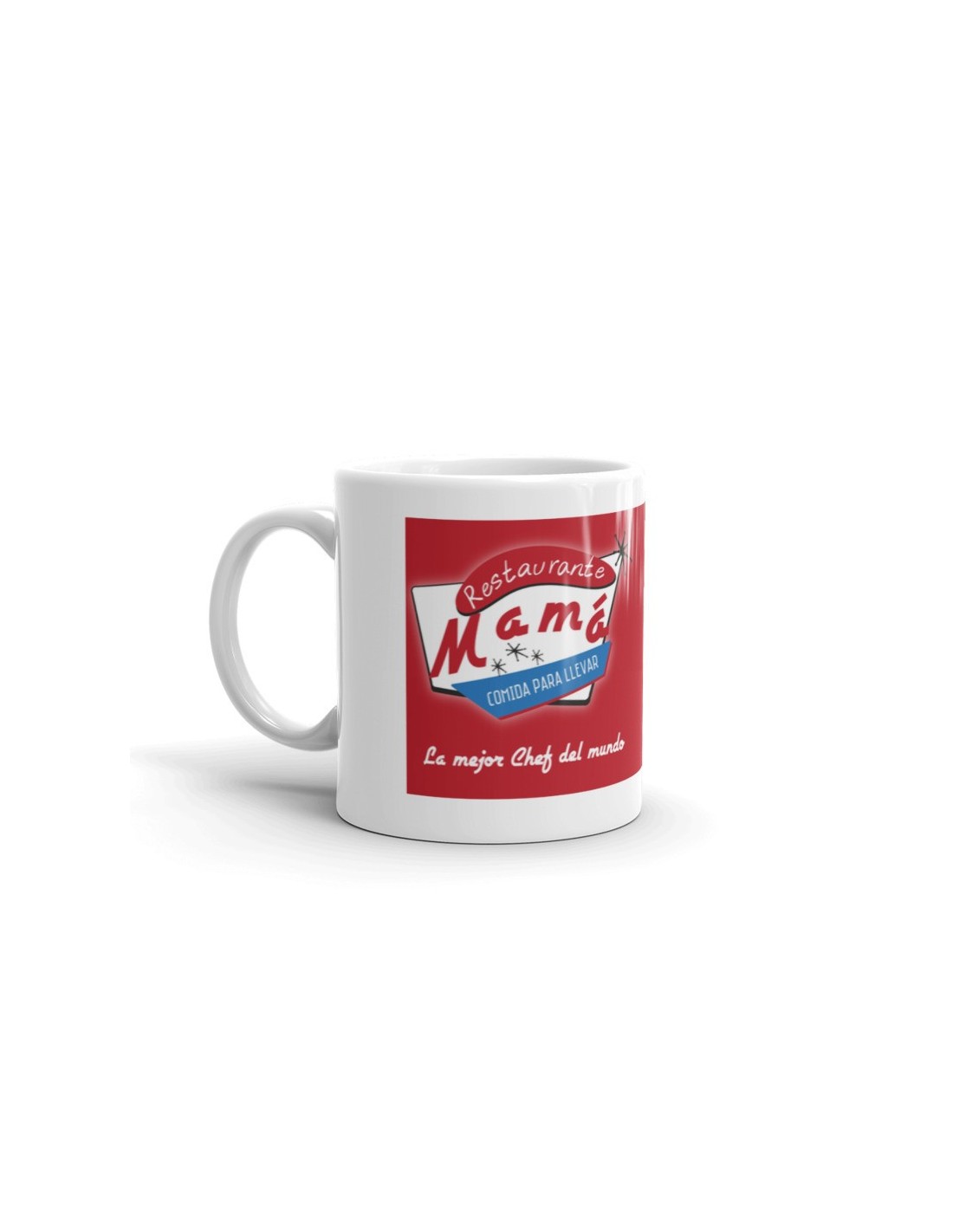 Original taza de porcelana blanca con asa, decorada con estilo retro, simulando un restaurante llamado "mamá".
