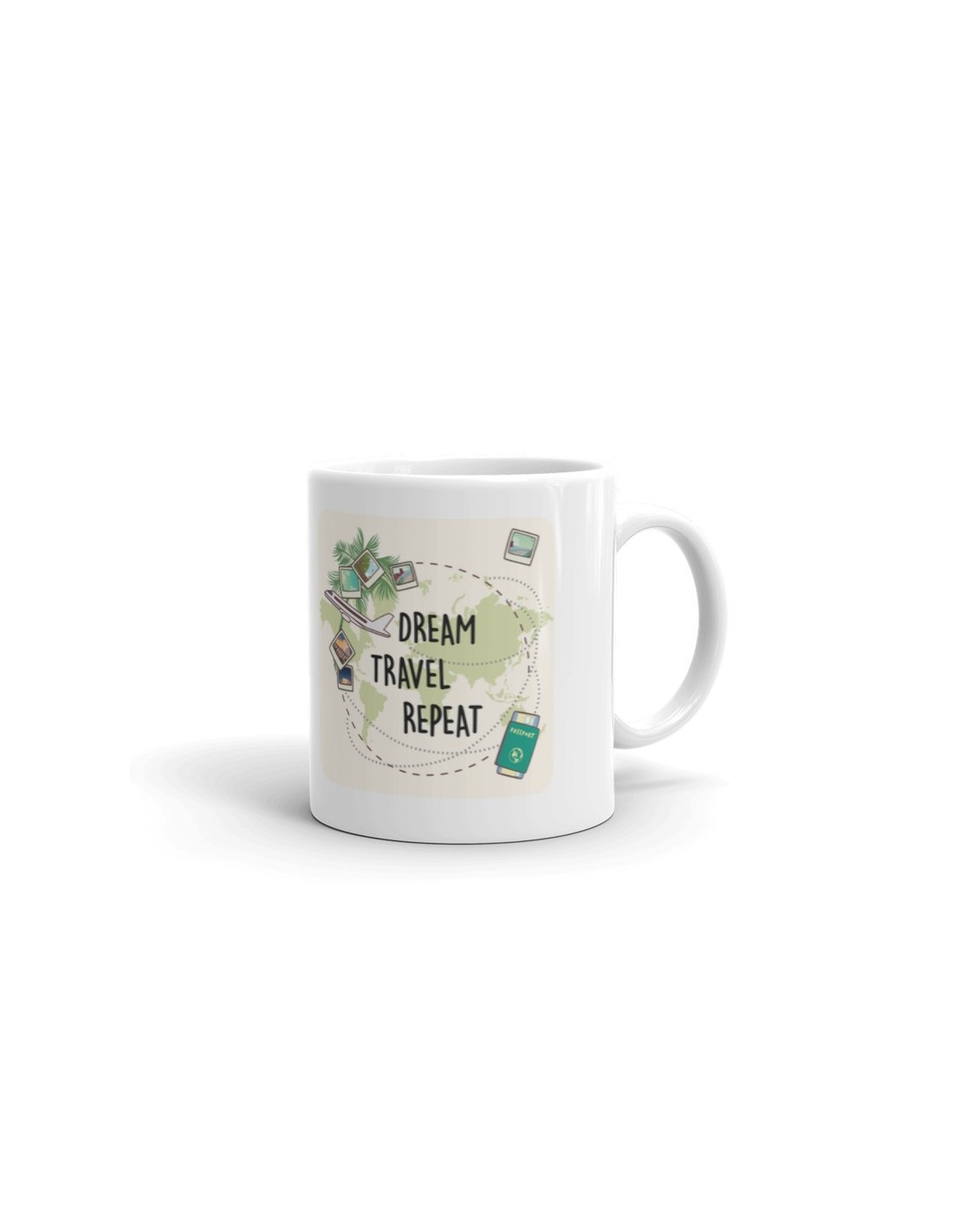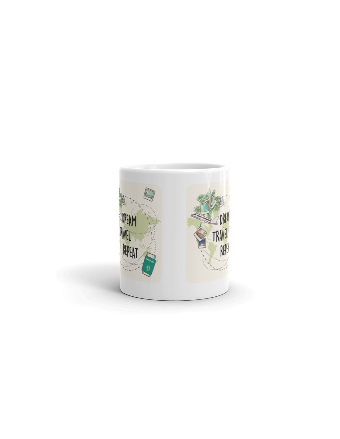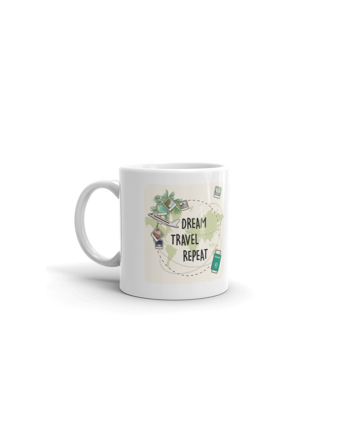 Original taza de porcelana decorada con el mensaje "Dream, travel, repeat" y motivos de viaje.