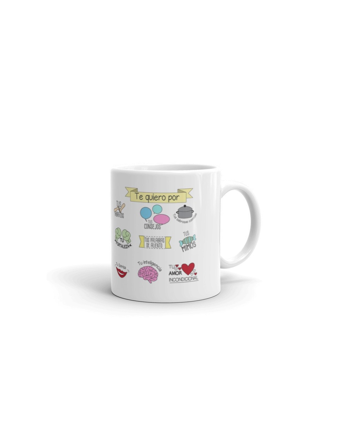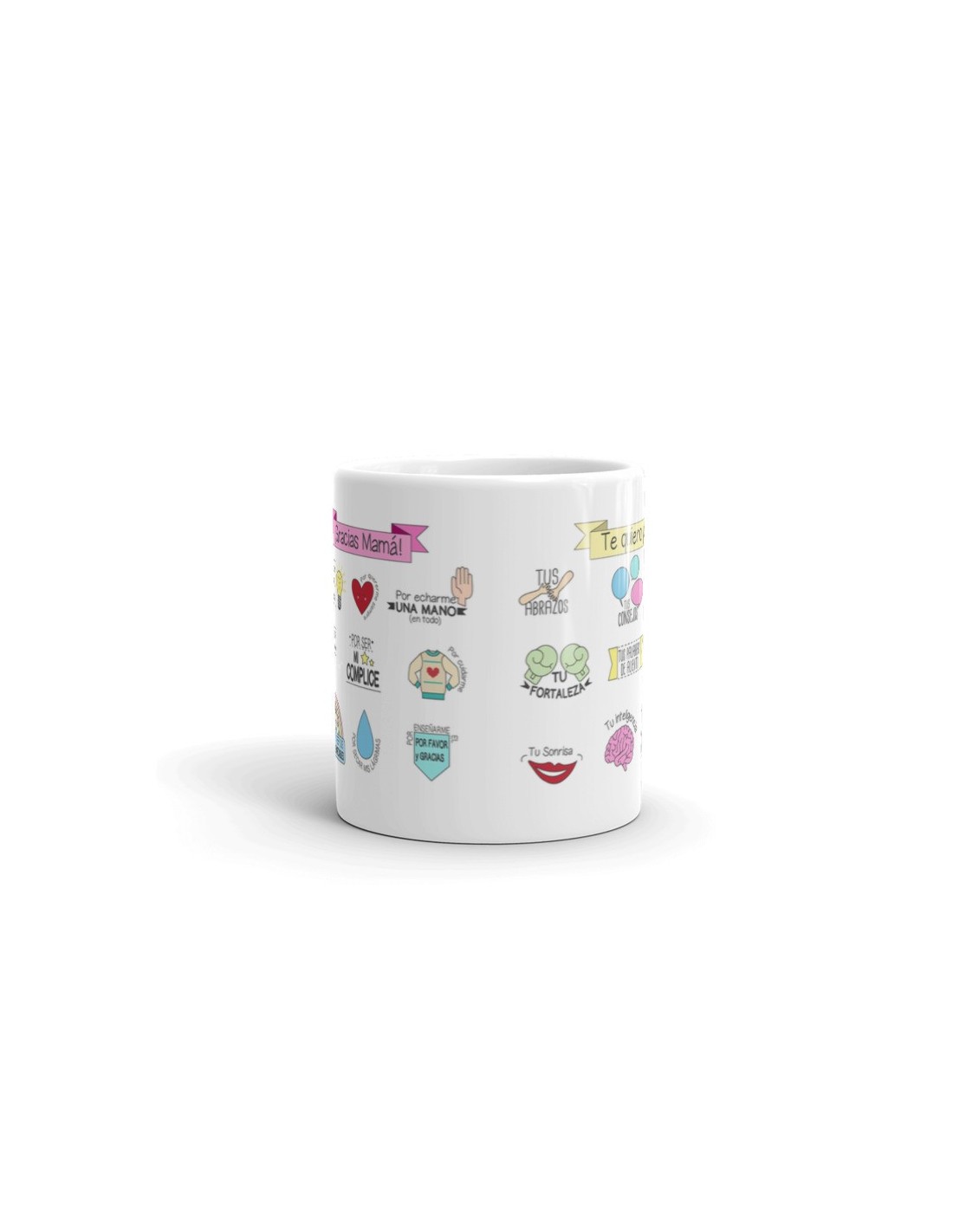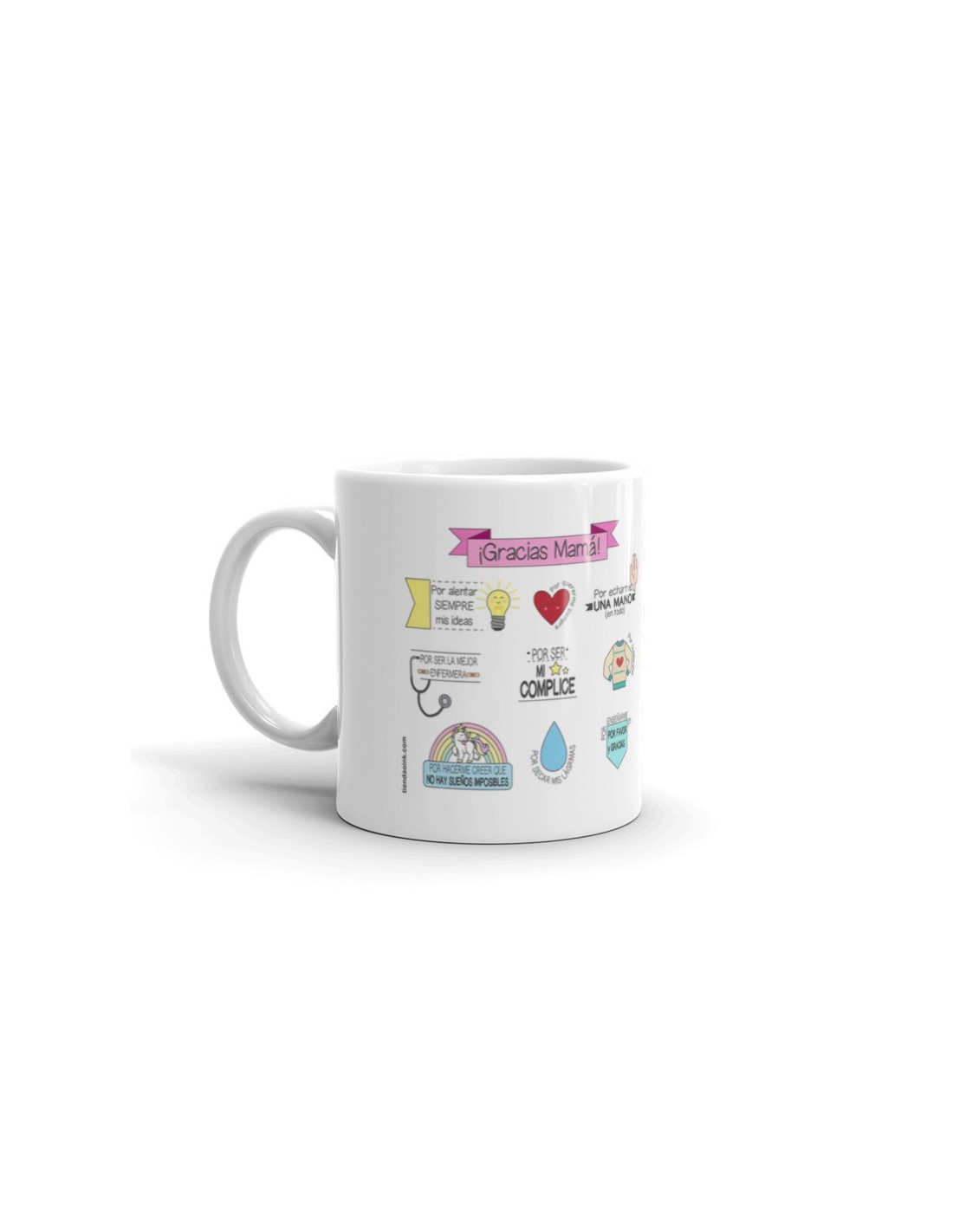 Original taza de porcelana blanca con asa, decorada con mensaje "Gracias mamá".