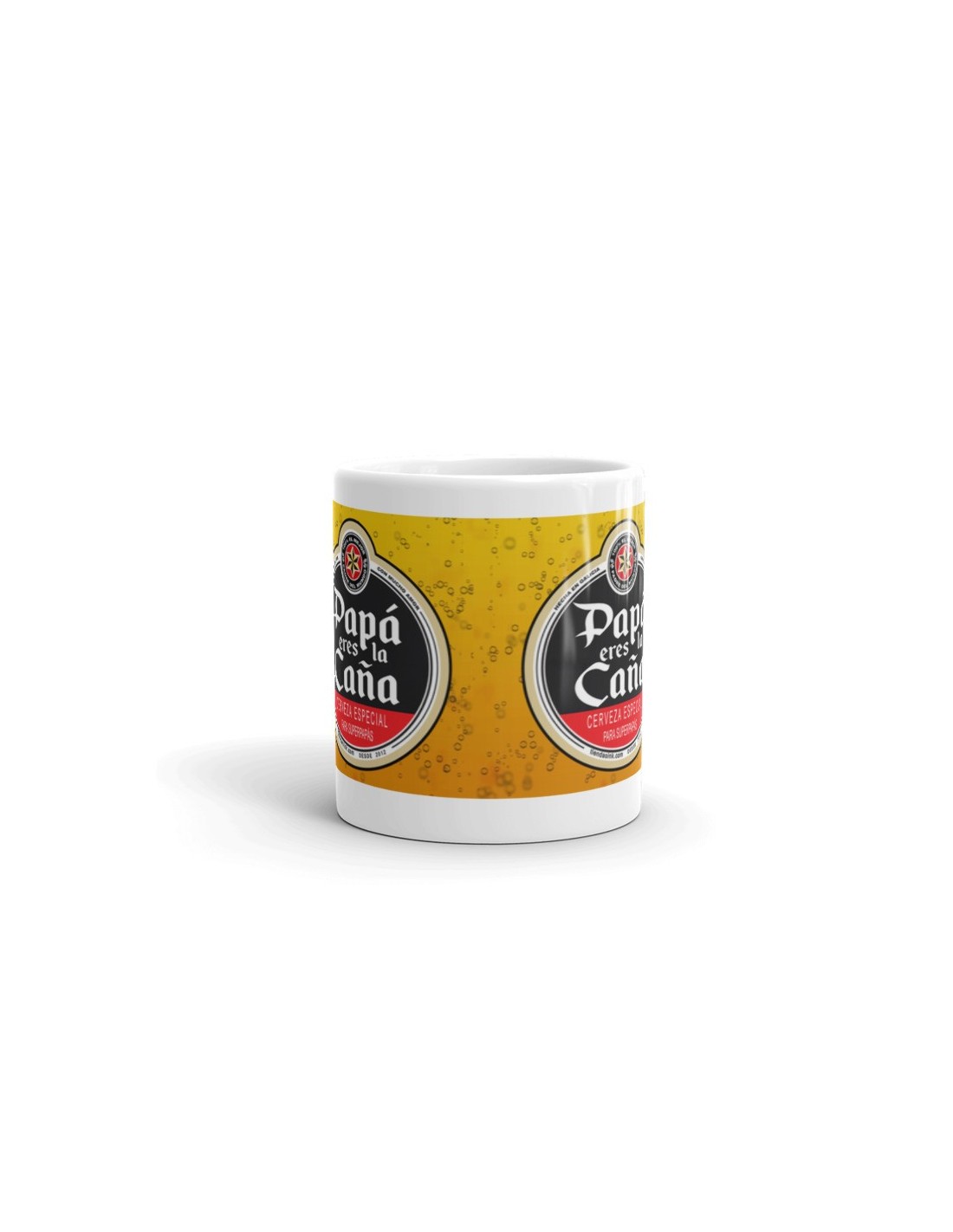 Original taza de porcelana blanca con asa, decorada con un logotipo de Hotel Mamá y los servicios que ofrece.