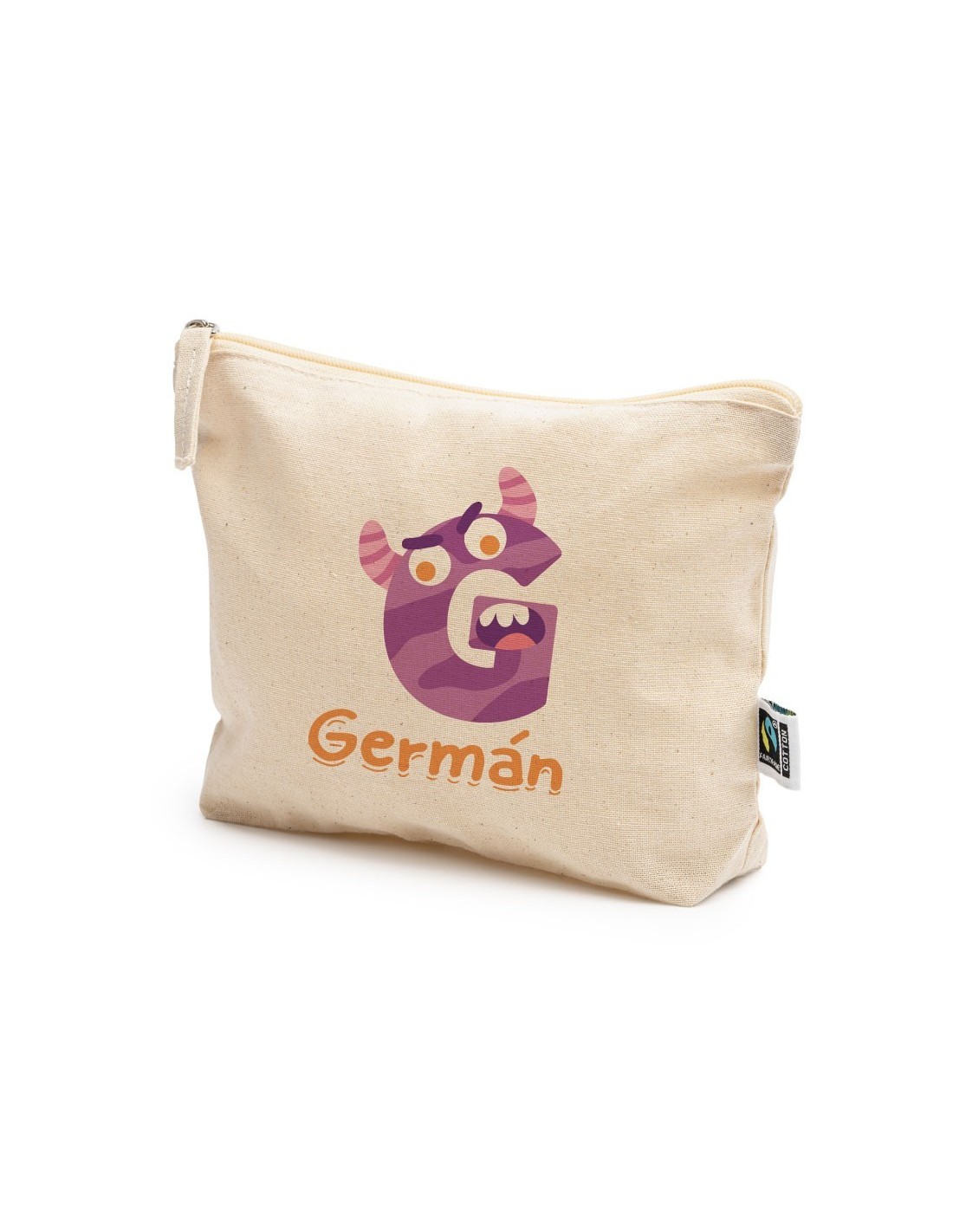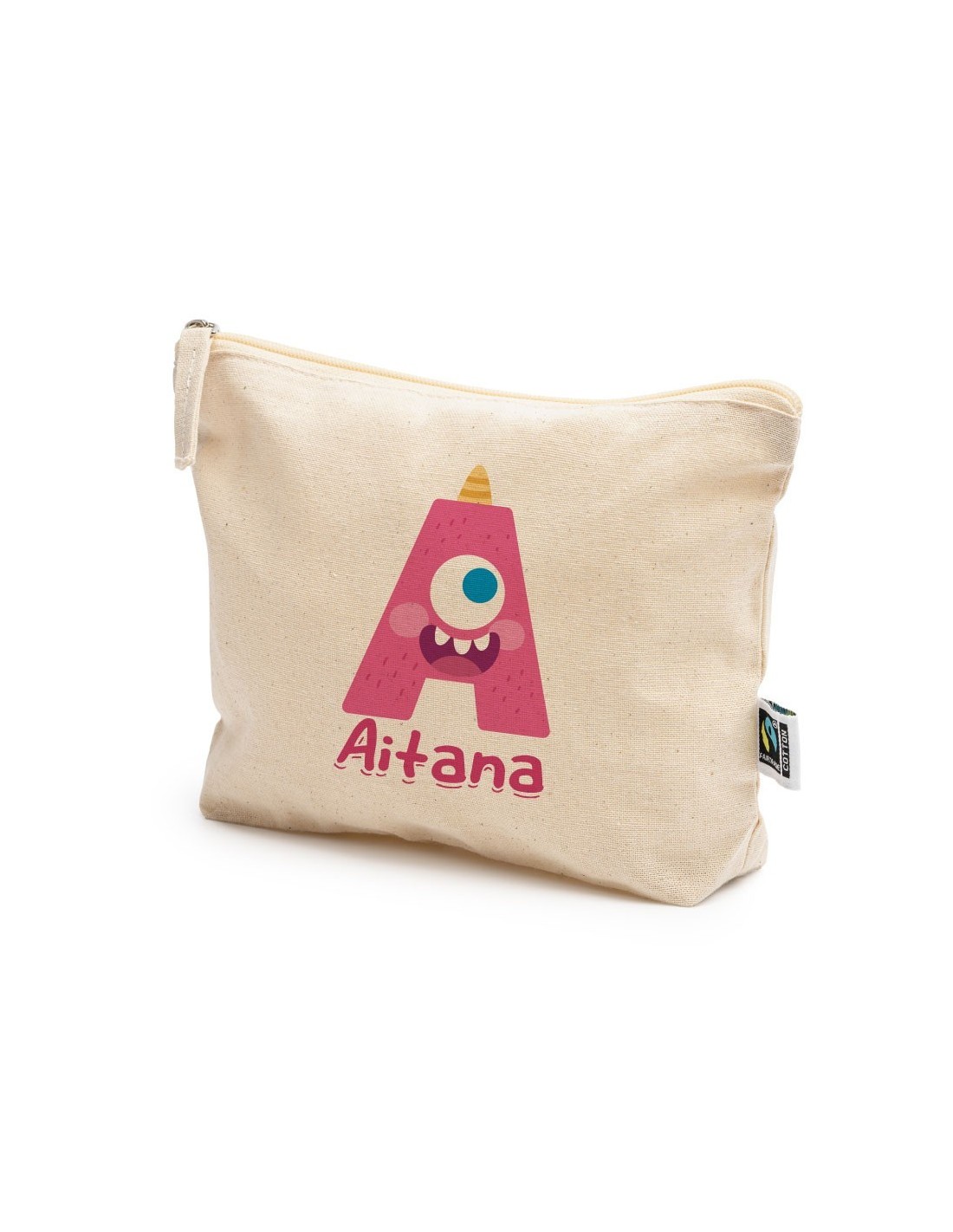 Original neceser de algodón decorado con nombre y divertida inicial en forma de monstruito.